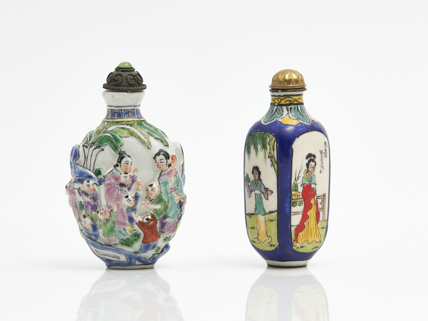 TWO EARLY CHINESE FIGURAL SNUFF BOTTLES INCLUDING ONE PORCELAIN AND ONE ENAMEL H.7.5CM (TALLEST), LEONARD JOEL DELIVERY SIZE: SMALL
