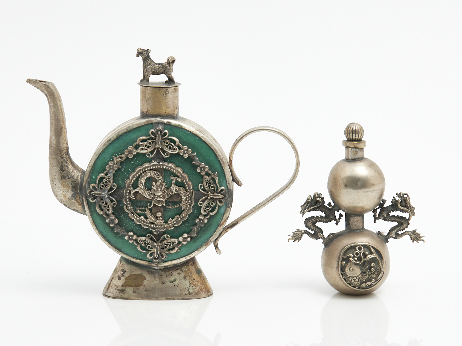 TWO SIGNED CHINESE SILVER SNUFF BOTTLES INCLUDING ONE GOURD FORM WITH DRAGONS THE OTHER JADE WITH OVERLAID DRAGON W.12CM (LARGEST), LEONARD JOEL DELIVERY SIZE: SMALL