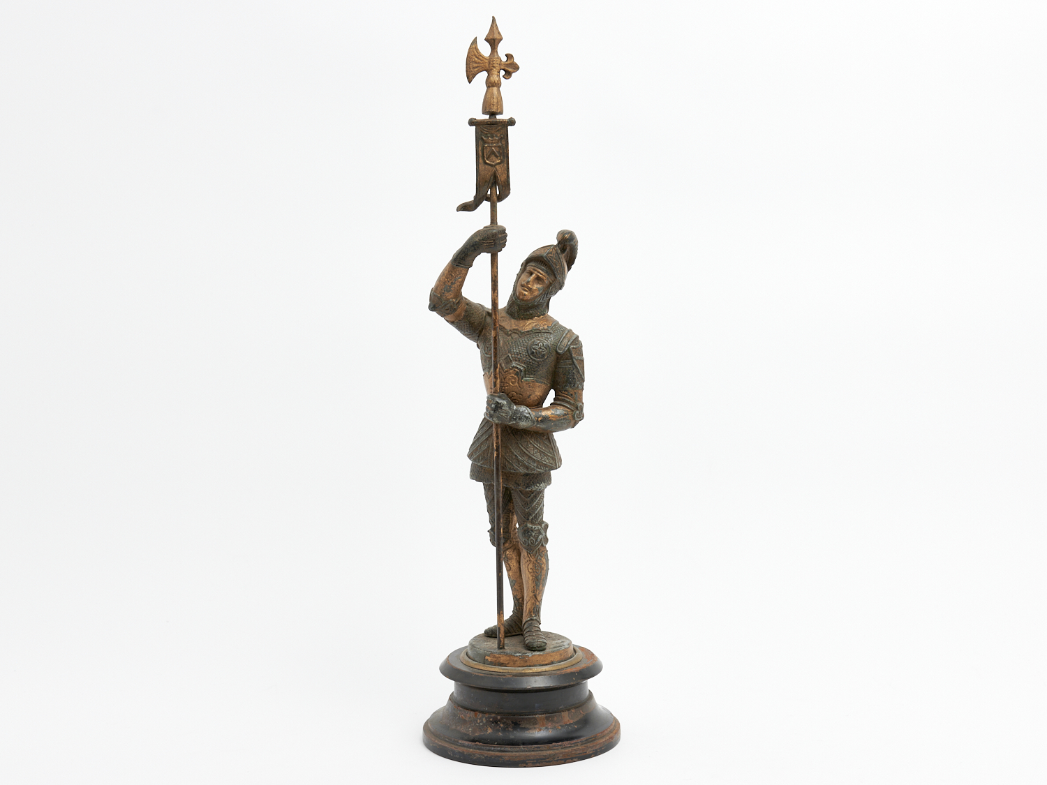 A 19TH CENTURY EUROPEAN BRONZED SPELTER FIGURE OF A KNIGHT ON ORIGINAL WOODEN BASE H.49.5CM, LEONARD JOEL DELIVERY SIZE: SMALL