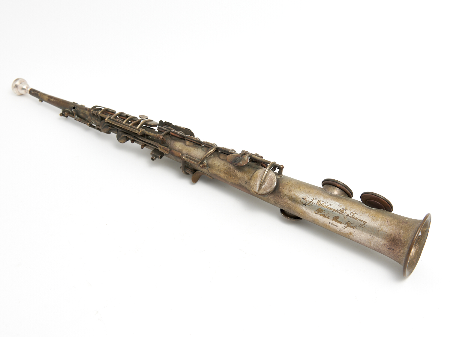 A 19TH-CENTURY SILVER PLATE BRASS PARIS MADE ALTO SAX BY CHIBOURVILLE LAMY (A/F) L.67CM, LEONARD JOEL DELIVERY SIZE: SMALL