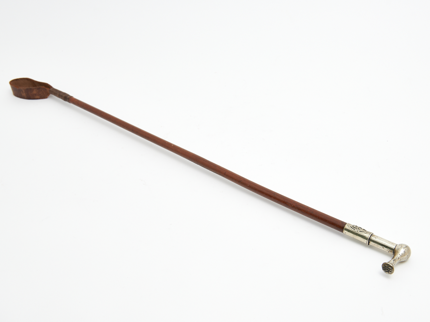 A 19TH CENTURY ENGLISH SILVER TOPPED CANE SHAFTED RIDING CROP WITH HUNT SCENE TO MOUNT L.73CM, LEONARD JOEL DELIVERY SIZE: SMALL