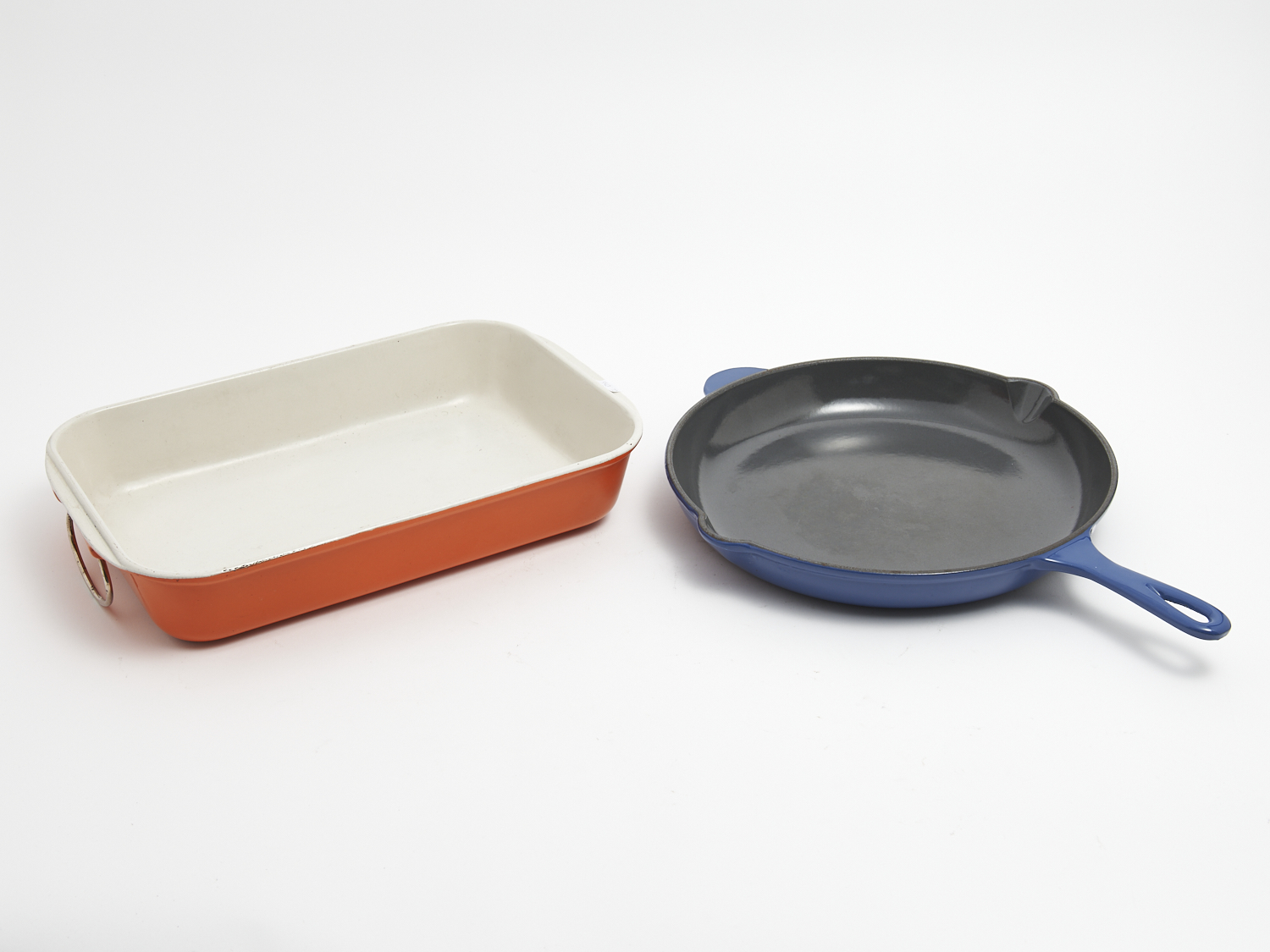 A FRENCH LE CRUESET BLUE AND ORANGE ENAMEL FRYPAN AND BAKING DISH DIA.31CM (PAN), LEONARD JOEL LOCAL DELIVERY SIZE: SMALL