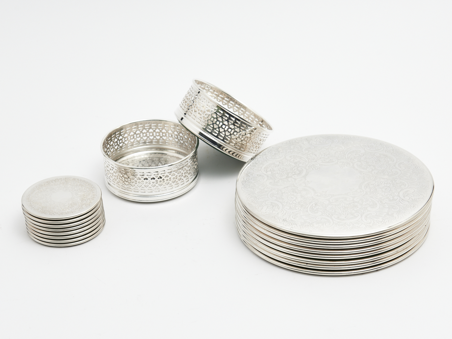 A SET OF EIGHT STRACHAN SILVERPLATE PLACEMATS DRINK COASTERS AND MATCHED BOTTLE COASTERS DIA.20.5CM (PLACEMAT), LEONARD JOEL LOCAL DELIVERY SIZE: SMALL