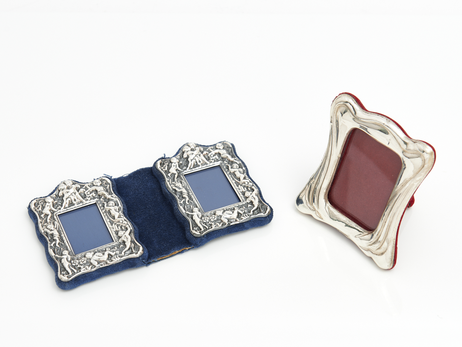 TWO ENGLISH HALLMARKED STERLING SILVER PICTURE FRAMES INCLUDING CHERUB ADORNED FOLDING AND RED VELVET BACKED H.9.5CM, LEONARD JOEL LOCAL DELIVERY SIZE: SMALL