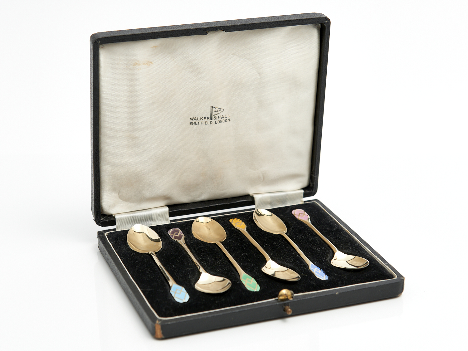 AN ART DECO BOXED SET OF SIX ENGLISH HALLMARKED STERLING SILVER WALKER AND HALL GUILLOCHE ENAMEL AND GILT TEASPOONS, THE BOX 15CM WIDE LEONARD JOEL DELIVERY SIZE: SMALL