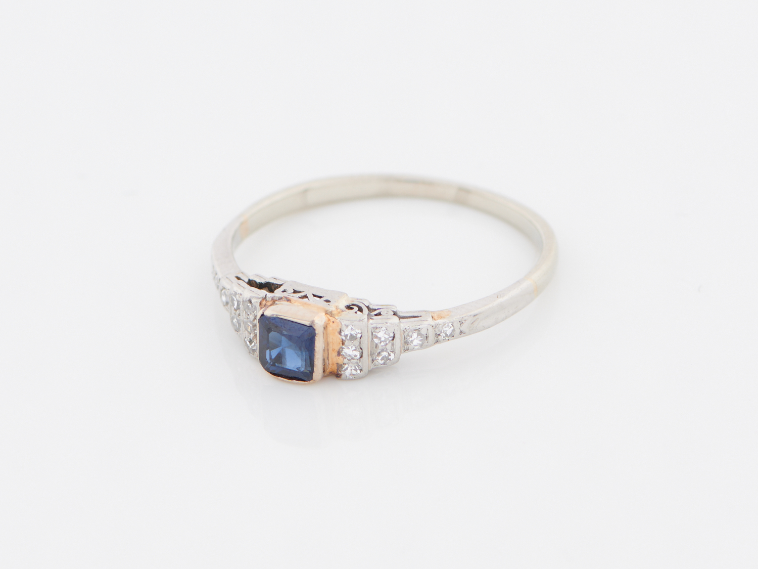 AN ART DECO STYLE SAPPHIRE AND DIAMOND RING IN 18CT WHITE GOLD, SIZE N, 2.1GMS
