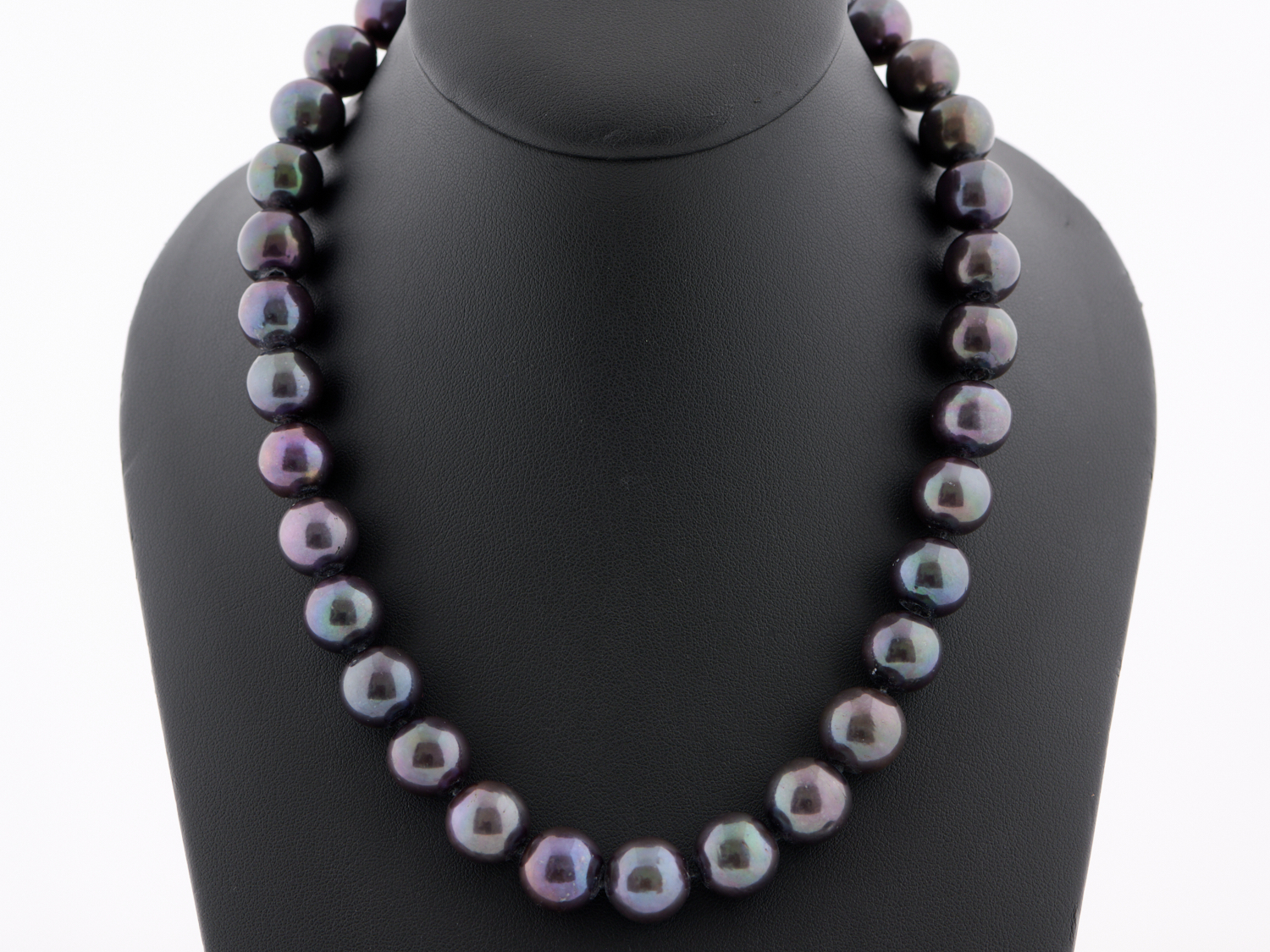 A STRAND OF GREY FRESHWATER PEARLS TO A CLASP IN SILVER, 600MM