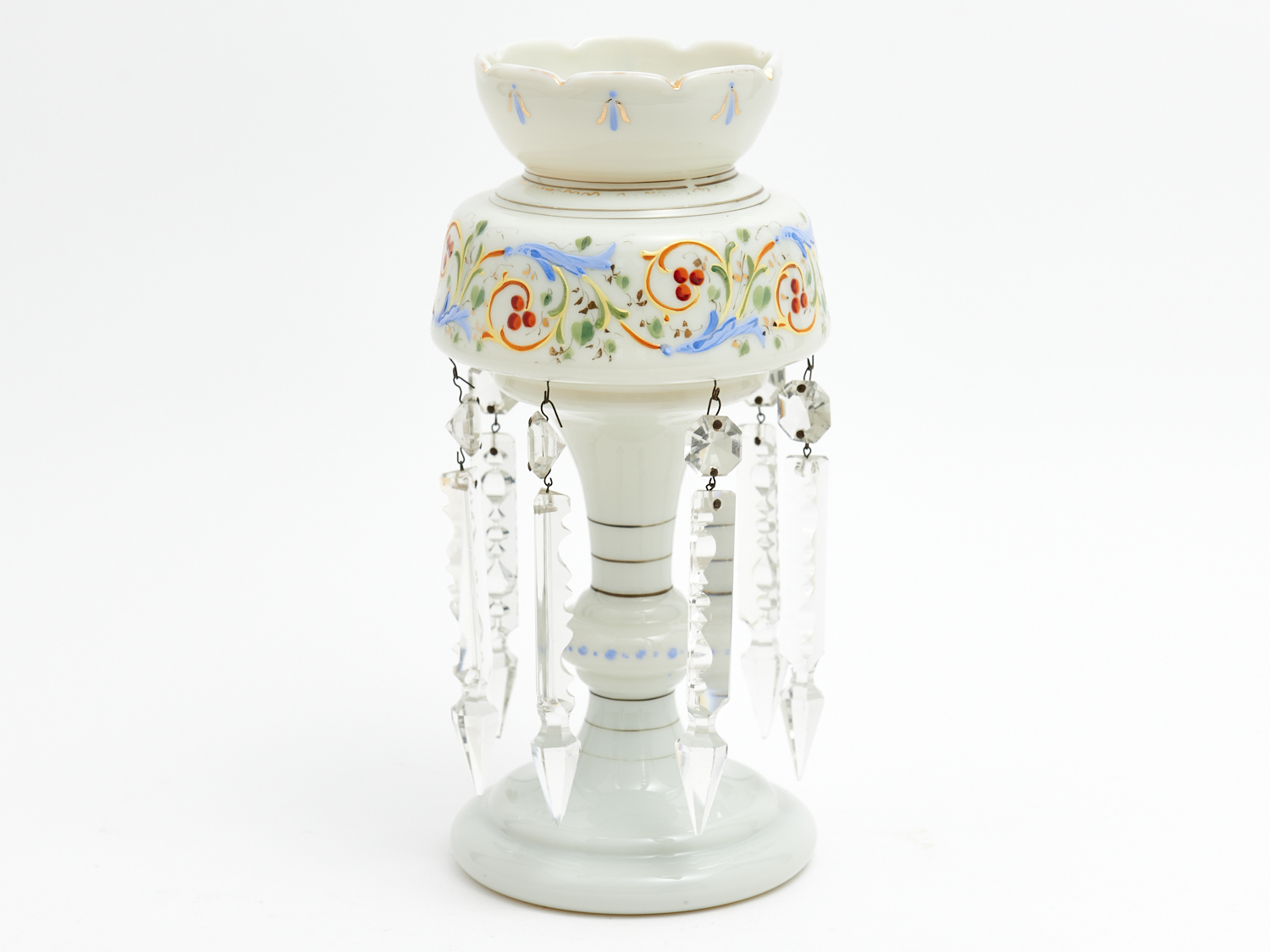 A MILK GLASS LUSTRE VASE WITH COLOURFUL ENAMEL DECORATION H.28CM, LEONARD JOEL DELIVERY SIZE: MEDIUM