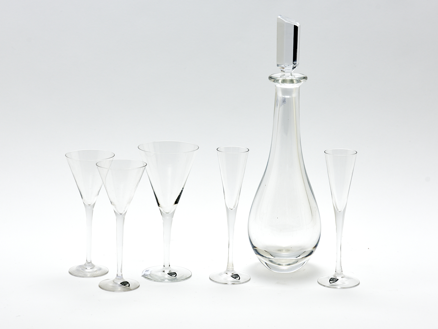 A SET OF FIVE FLARED CRYSTAL ORREFORS WINE FLUTES AND SIGNED DECANTER BY VICKE LANDSTRAND H.37CM (DECANTER), LEONARD JOEL DELIVERY SIZE: MEDIUM