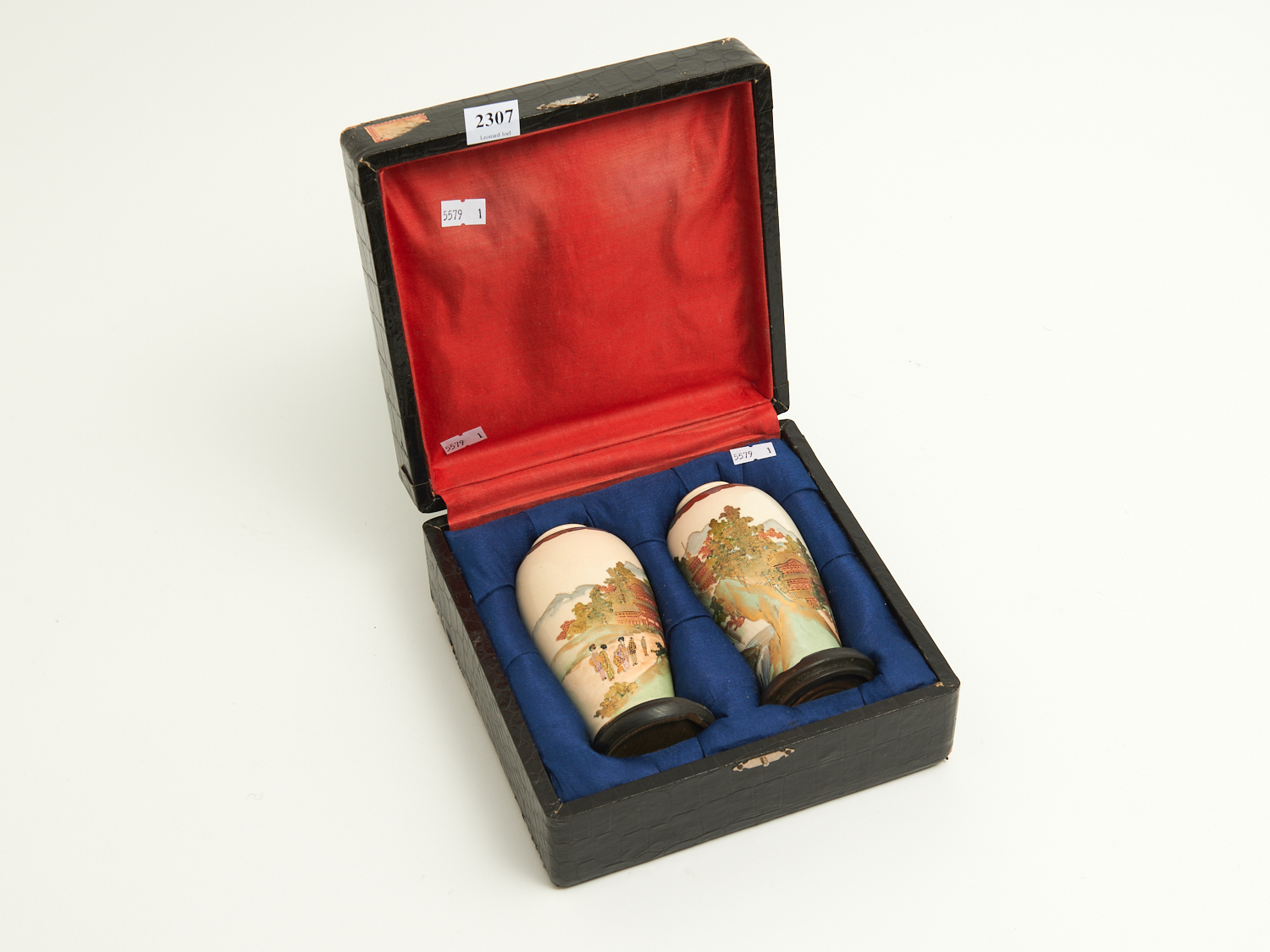 A PAIR OF JAPANESE SATSUMA VASES ON STANDS WITH A DISPLAY BOX H.12.5CM (EACH VASE), LEONARD JOEL DELIVERY SIZE: SMALL