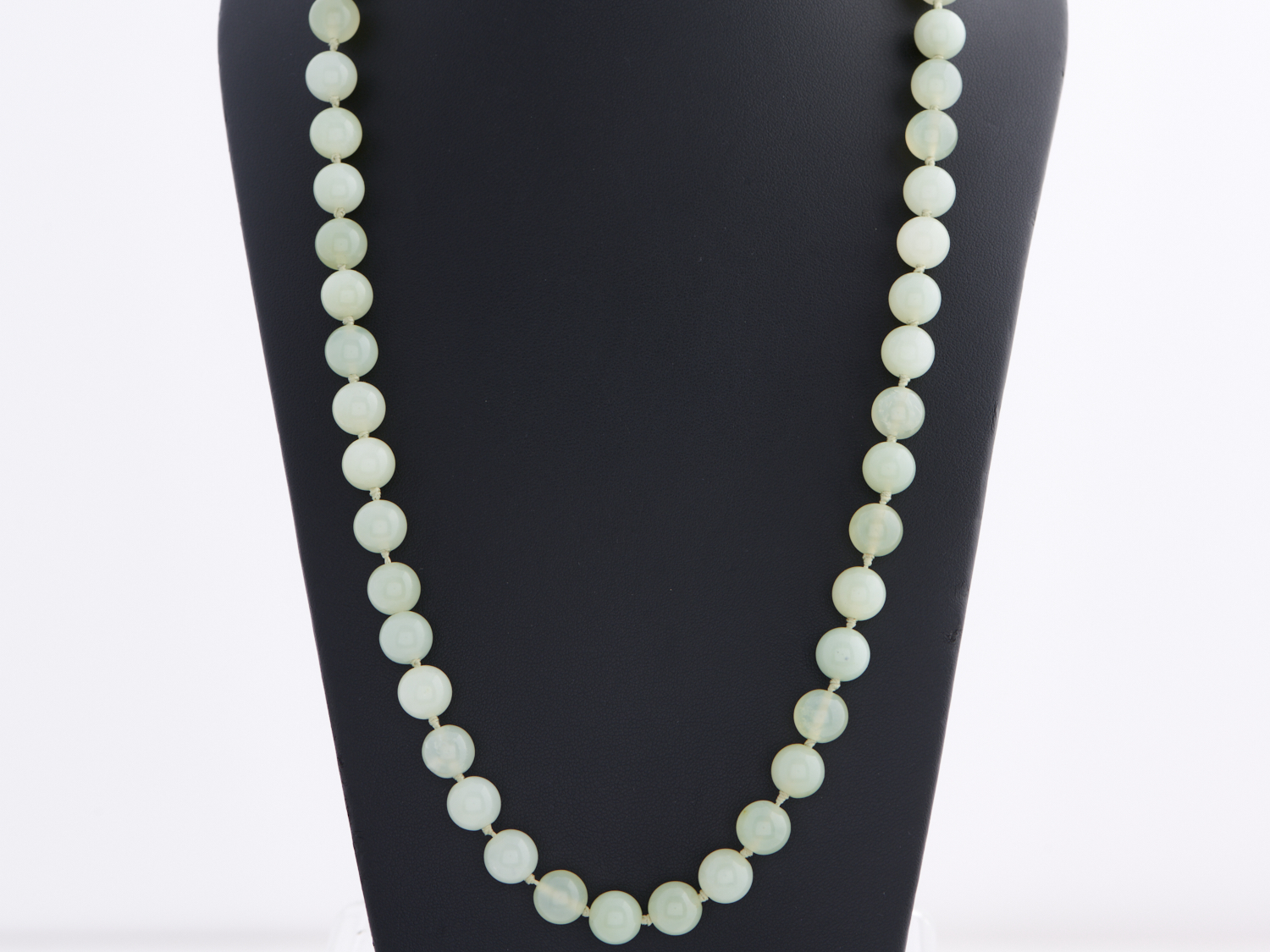 A VINTAGE STRAND OF HAND KNOTTED JADE BEADS TO A CLASP IN SILVER GILT, LENGTH 630MM
