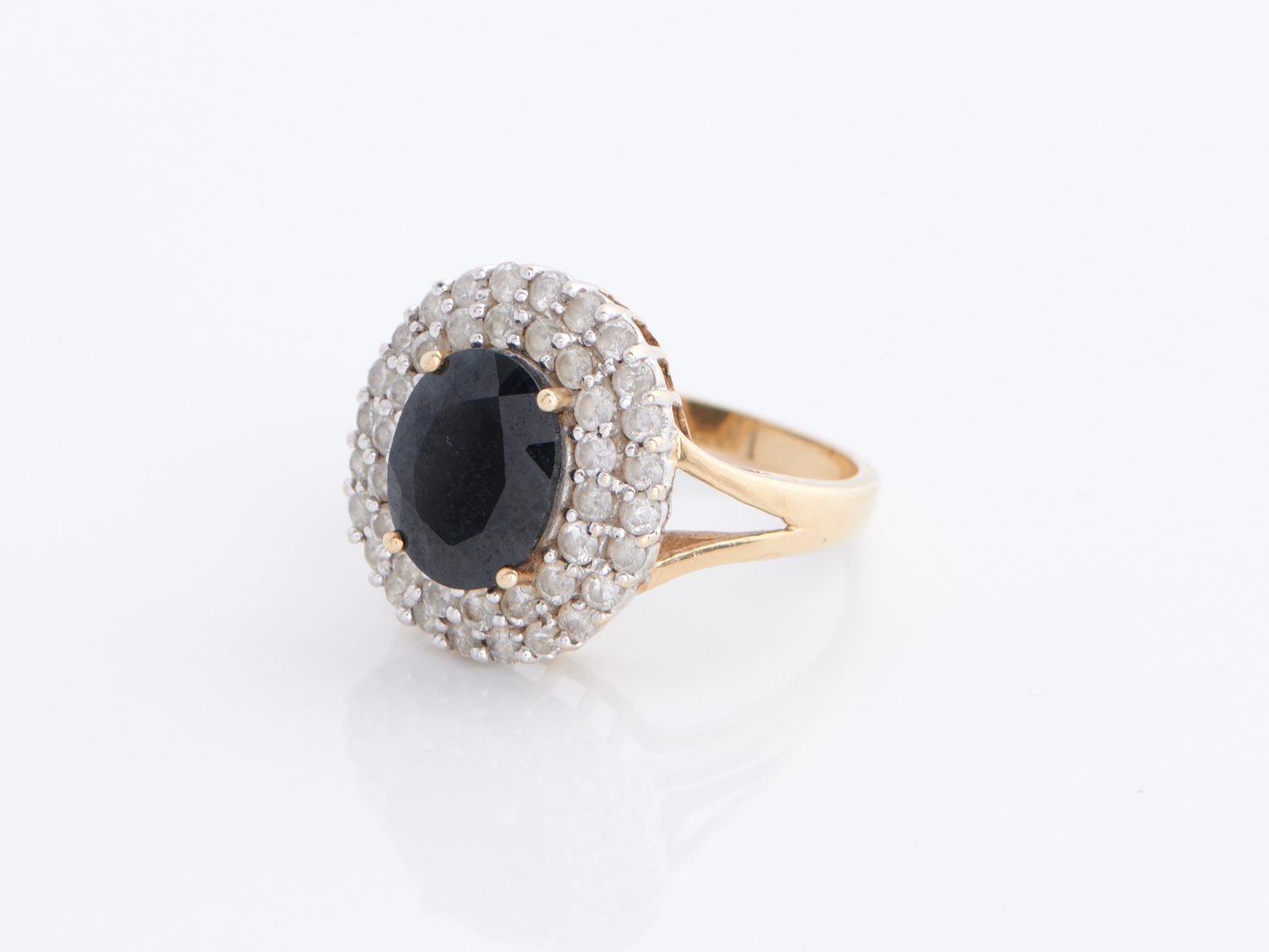 A SAPPHIRE AND DIAMOND CLUSTER RING IN 9CT GOLD, SIZE M, 4.3GMS