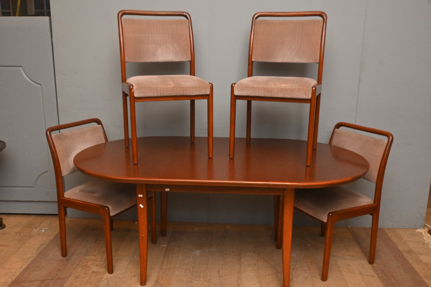 A NOBLETT EXTENSION DINING TABLE WITH FOUR MATCHED CHAIRS (A/F) (TABLE 74H X 182W X 101D CM) (PLEASE NOTE THIS HEAVY ITEM MUST BE REMOVED BY CARRIERS AT THE CUSTOMER'S EXPENSE. LEONARD JOEL STAFF CANNOT ASSIST CARRYING THIS ITEM) (LARGE ITEM)