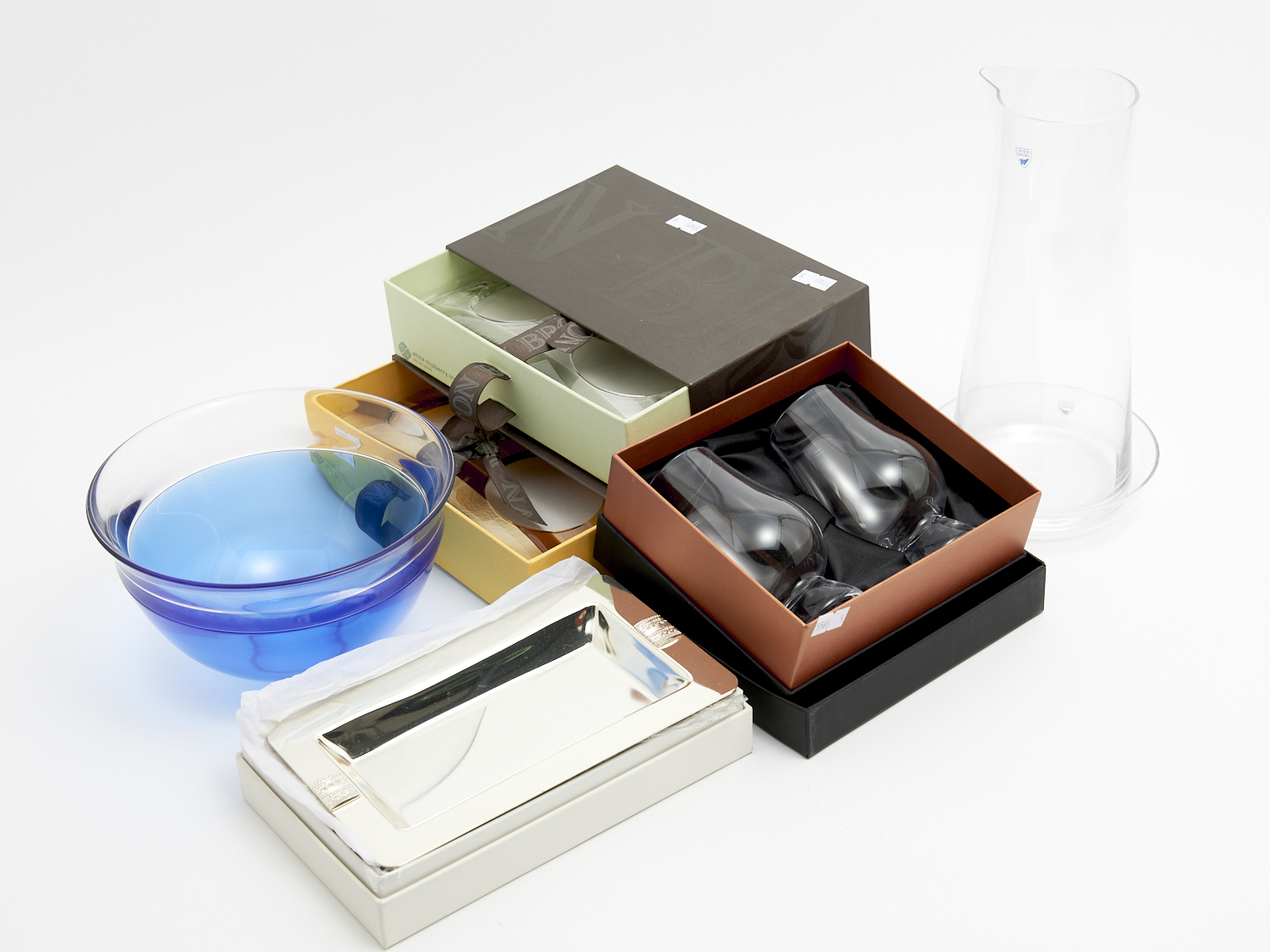 A COLLECTION OF BOXED GLASS TABLEWARE INCLUDING TWO MOLTON BROWN GLASS FRAMES, ORREFORS CARAF, ORREFORS SATURNUS BOWL, A PAIR OF GLENCAIRN GLASSES AND A VERA WANG DISH H.20CM (TALLEST BOX), LEONARD JOEL DELIVERY SIZE: MEDIUM