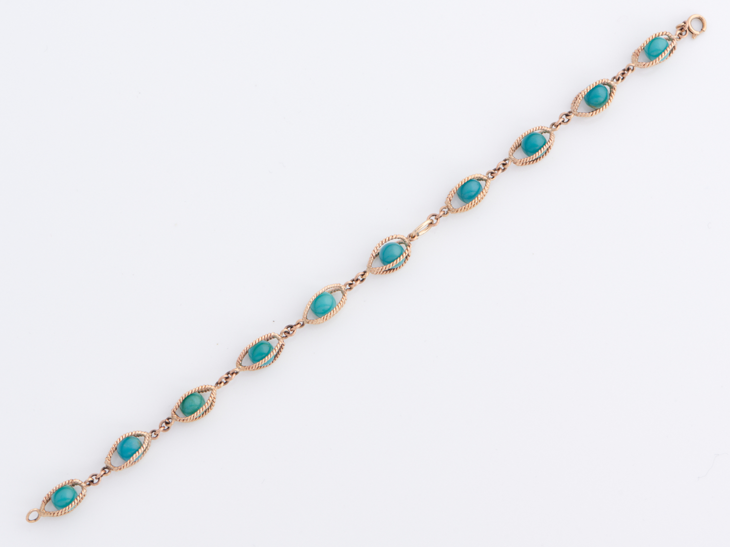A TURQUOISE BEAD BRACELET IN GOLD PLATE, LENGTH 194MM, 8.2GMS