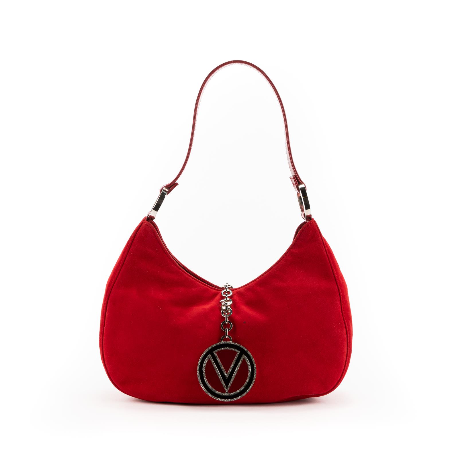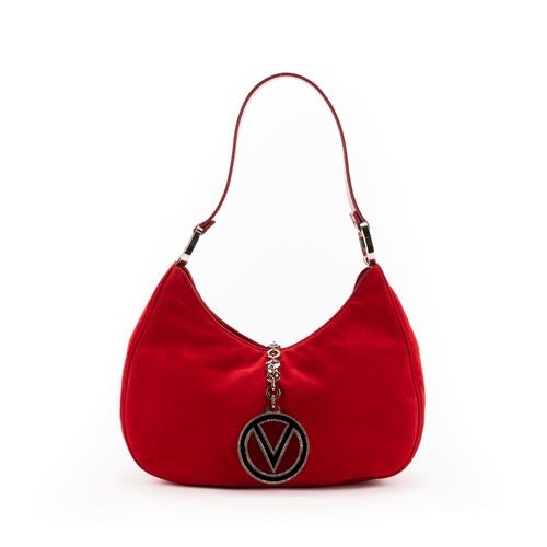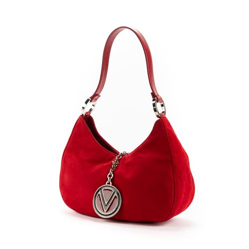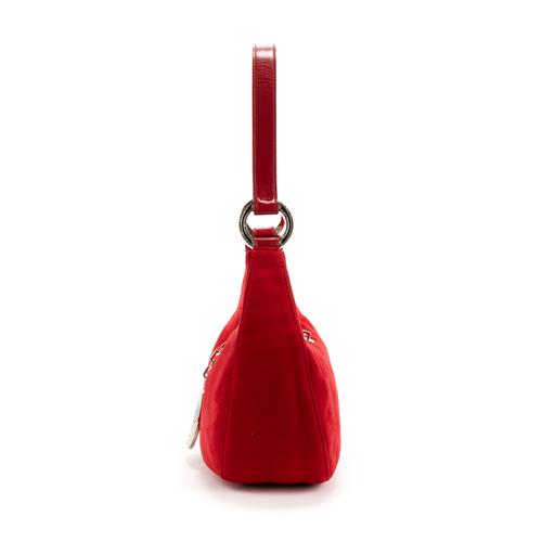 Styled in red suede leather with leather handle and silver tone metal, 26 x 15 x 8.5 cm