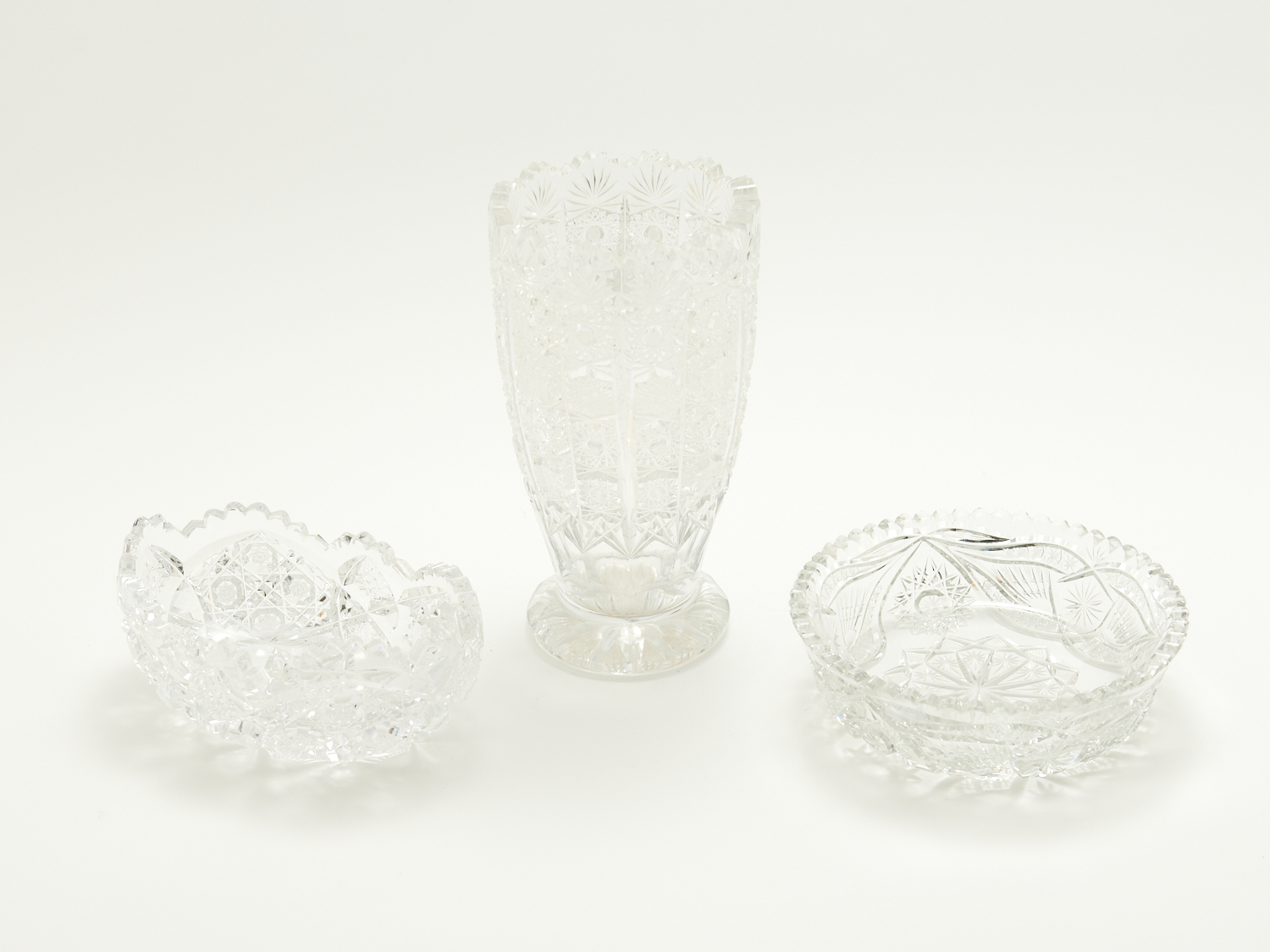 A 1930S CZECH CRYSTAL VASE AND TWO BOWLS H.26CM (TALLEST), LEONARD JOEL DELIVERY SIZE: MEDIUM