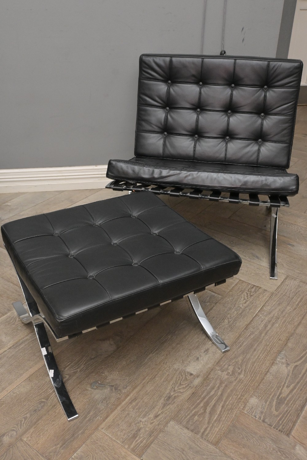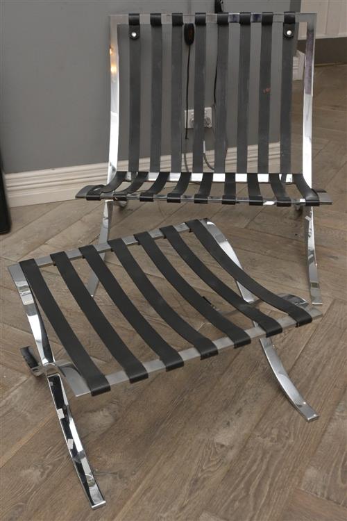 BLACK LEATHER BARCELONA STYLE CHAIR AND OTTOMAN (81H X 77W X 79D CM) (LEONARD JOEL DELIVERY SIZE: X-LARGE)
