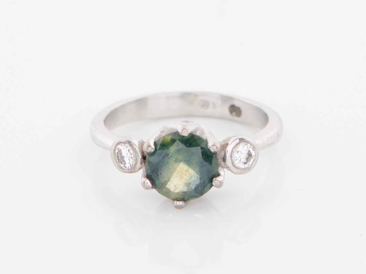 A SAPPHIRE AND DIAMOND RING IN 18CT WHITE GOLD, SIZE H, 3.2GMS