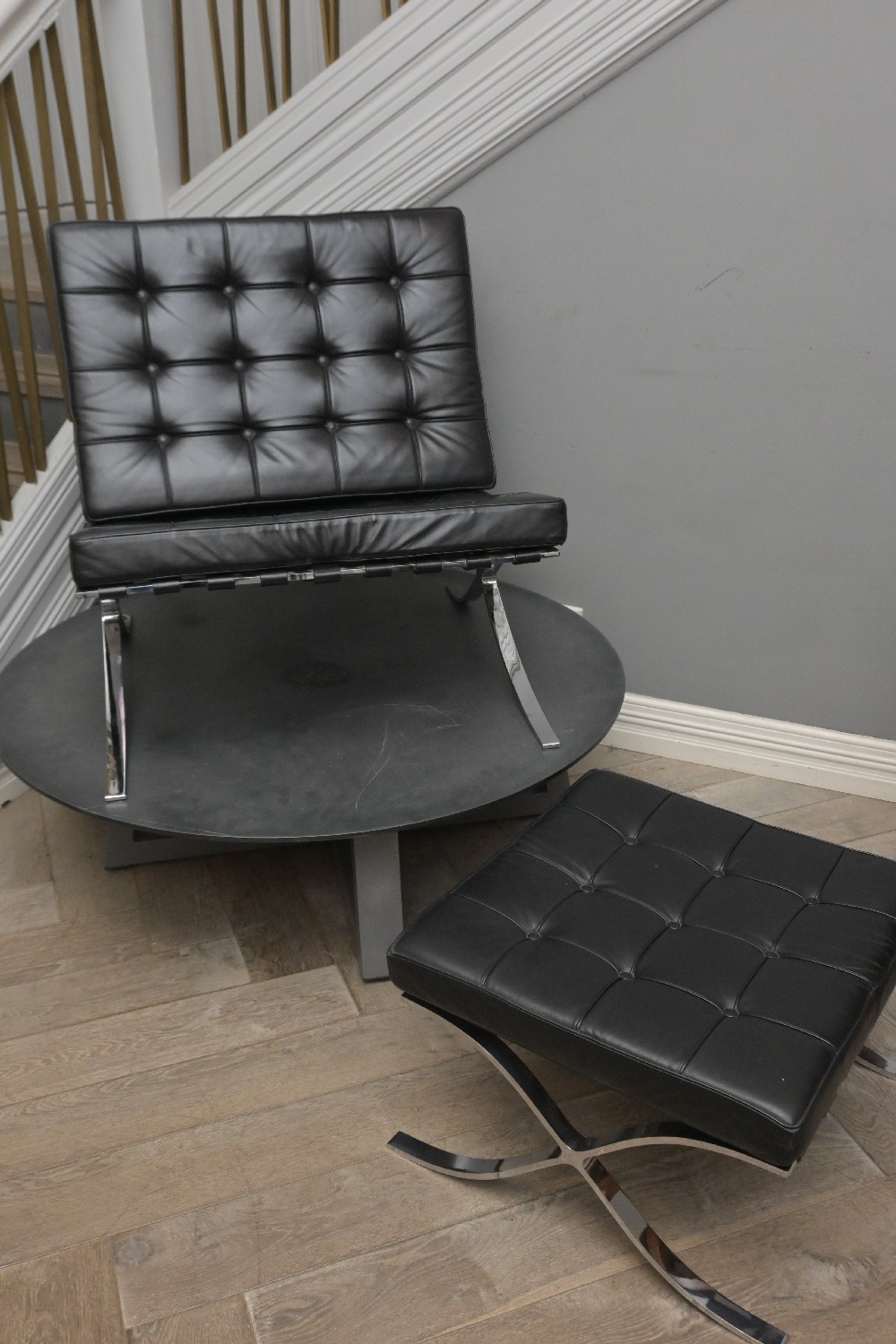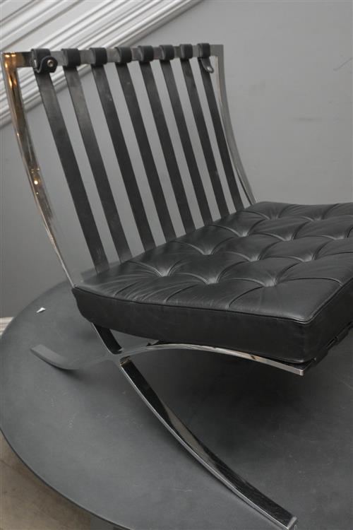 BLACK LEATHER BARCELONA STYLE CHAIR AND OTTOMAN (81H X 77W X 79D CM) (LEONARD JOEL DELIVERY SIZE: X-LARGE)