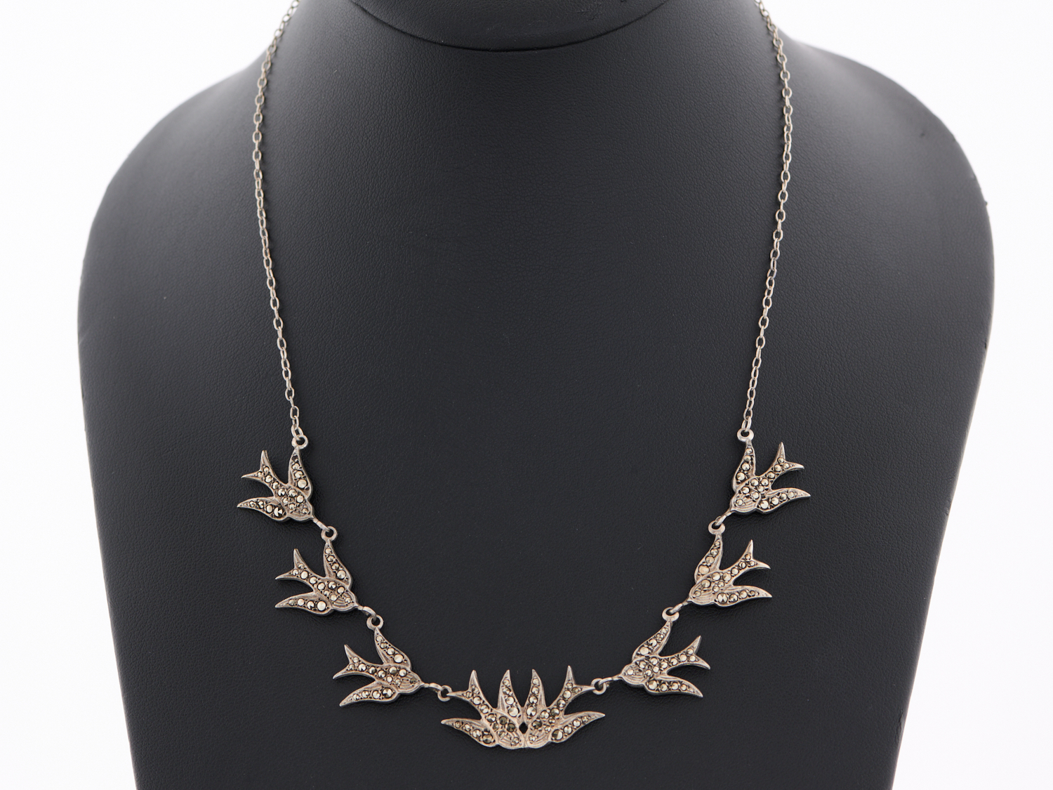 A VINTAGE MARCASITE SET 'SWALLOW' NECKLACE IN STERLING SILVER, APPROXIMATELY 440MM