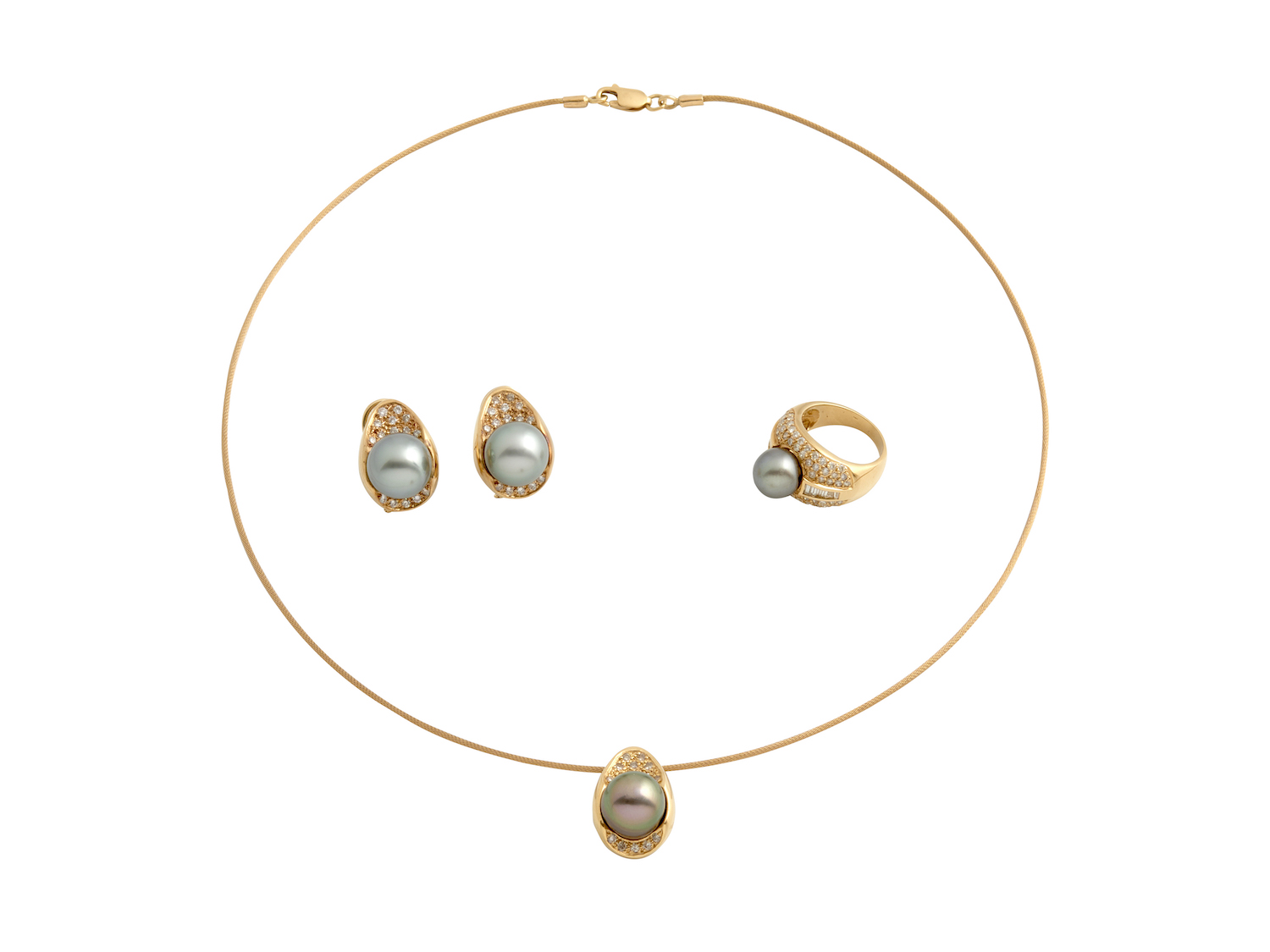 Comprising: a ring of bombé form, centring an off-round Tahitian cultured pearl, measuring approximately 9.9mm framed by baguette and brilliant-cut diamonds, size N, a pair of earrings en suite, length 21mm, post and clip fittings, and pendant omega necklace en suite, inner circumference 500mm. The diamonds together weighing approximately 1.50 carats, mounted in 18ct gold, gross weight approximately 48 grams (3).