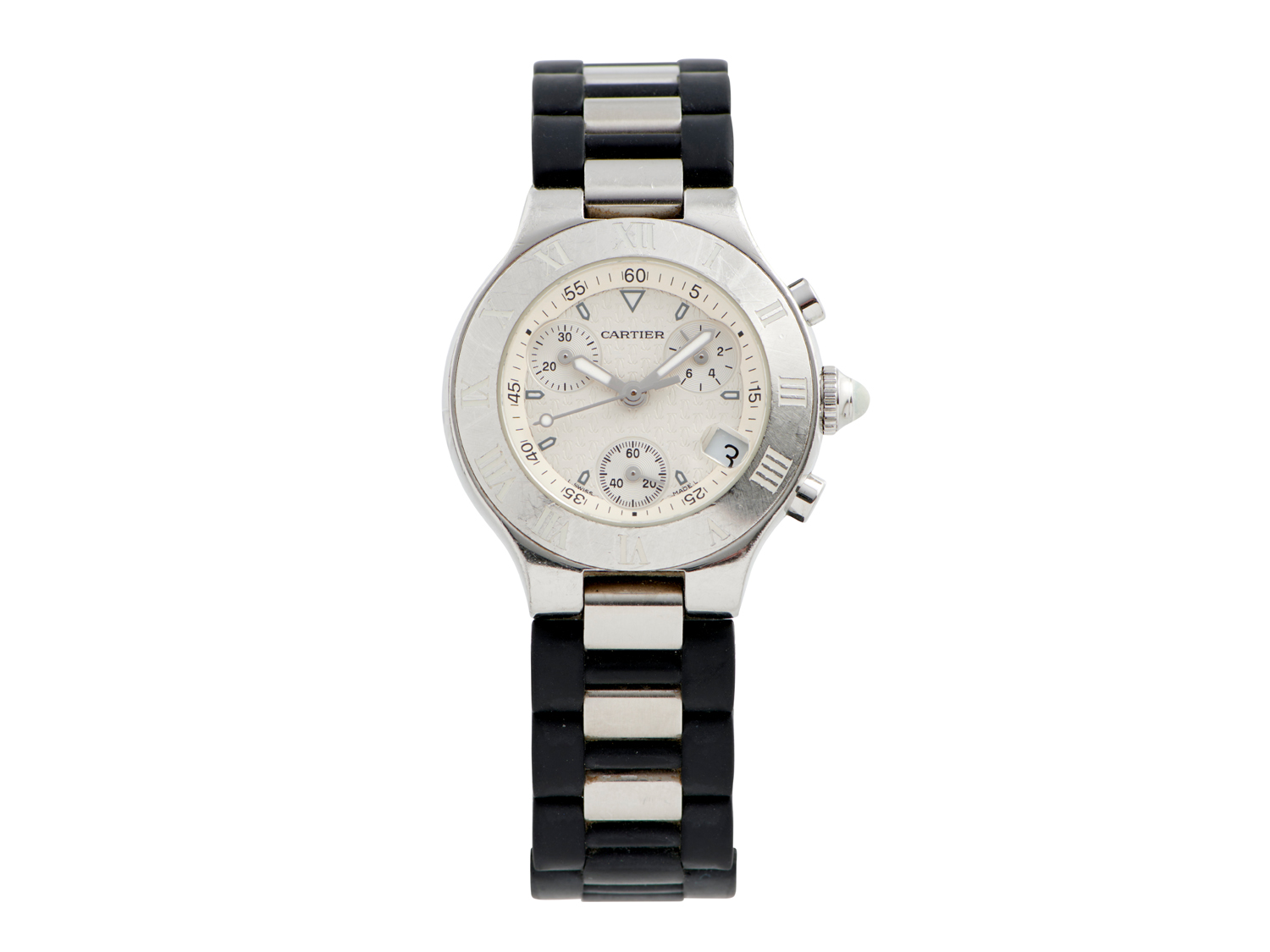 Dial: silvered Cartier motif, luminous bullet hour markers, polished sword hands with luminous inserts, lollipop centre chronograph hand, magnified date aperture at 4