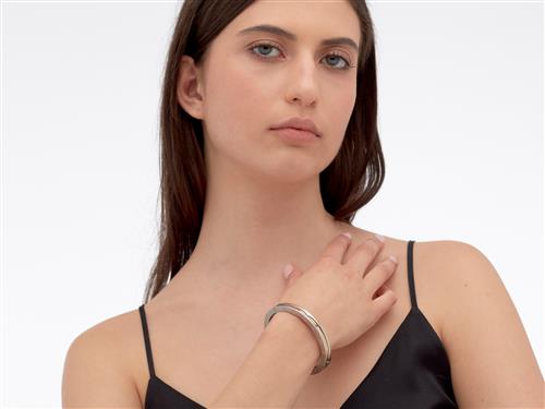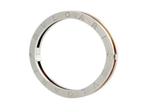 The oval hinged bangle centring an gold band flanked by a raised steel edge, the outer sides engraved BVLGARI BVLGARI, signed Bulgari, inner circumference approximately 165mm, gross weight approximately 26.7 grams.