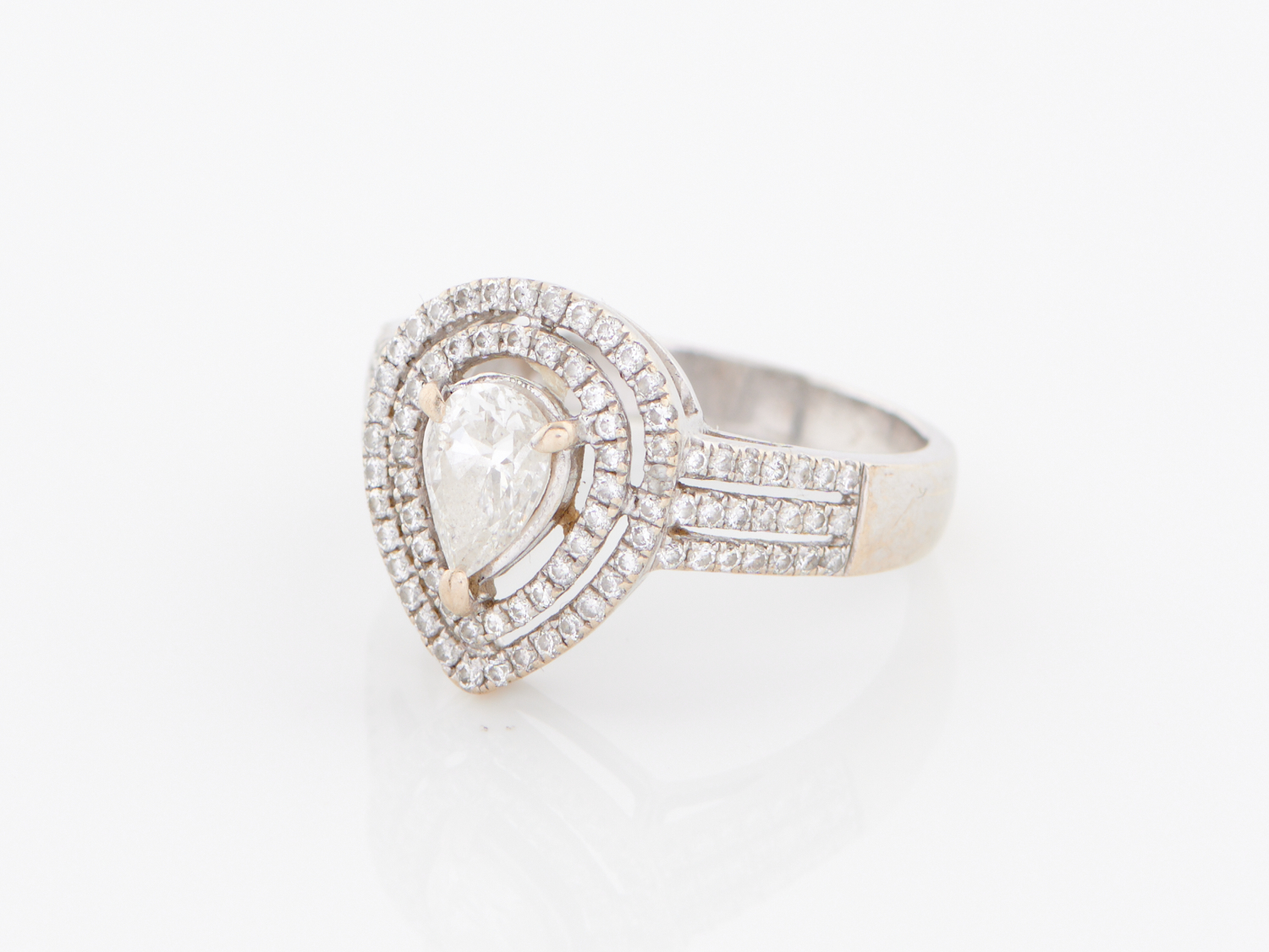 A PEAR-CUT DIAMOND CLUSTER RING IN 18CT WHITE GOLD, THE PEAR CUT DIAMOND OF APPOXIMATELY .70CTS, SIZE O, 4.4GMS