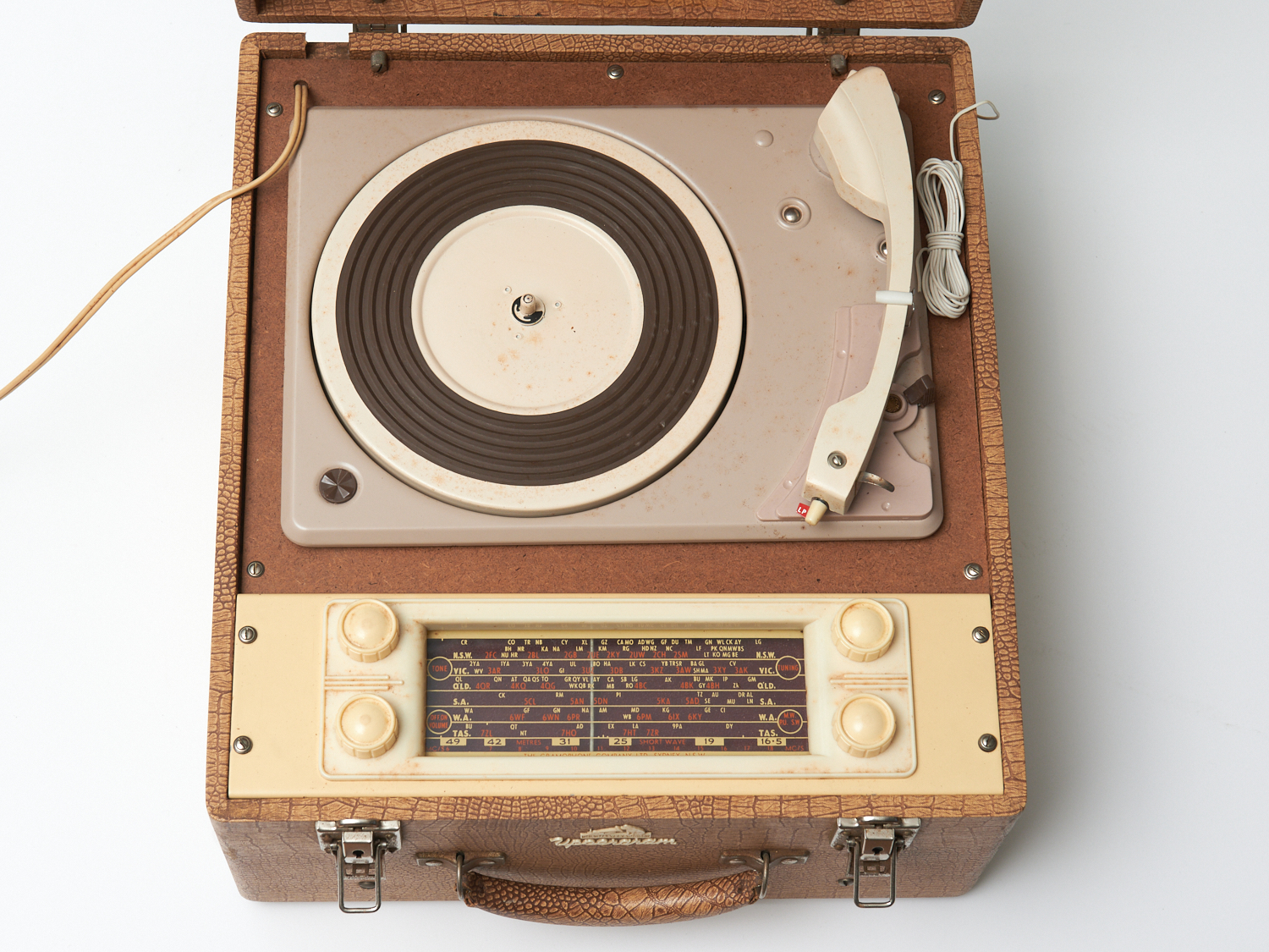 A 1960S 'HER MAJESTY'S VOICE' PORTABLE RECORD PLAYER AND RADIO W.36.5CM, LEONARD JOEL DELIVERY SIZE: MEDIUM