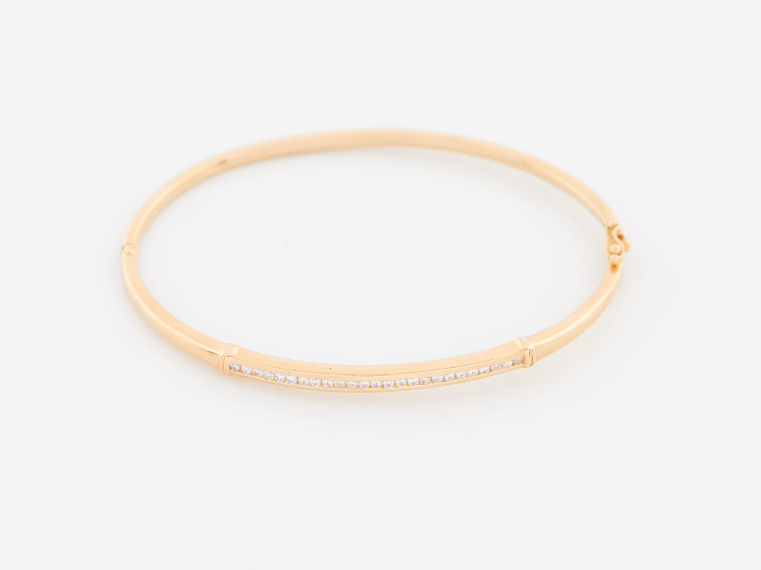 A DIAMOND HINGE BANGLE IN 18CT GOLD, THE DIAMONDS TOTALLING APPOXIMATELY 0.25CTS, INNER MEASUREMENT 48 X 60MM, 10.8GMS, ACCOMPANIED BY A COPY OF VALUATION