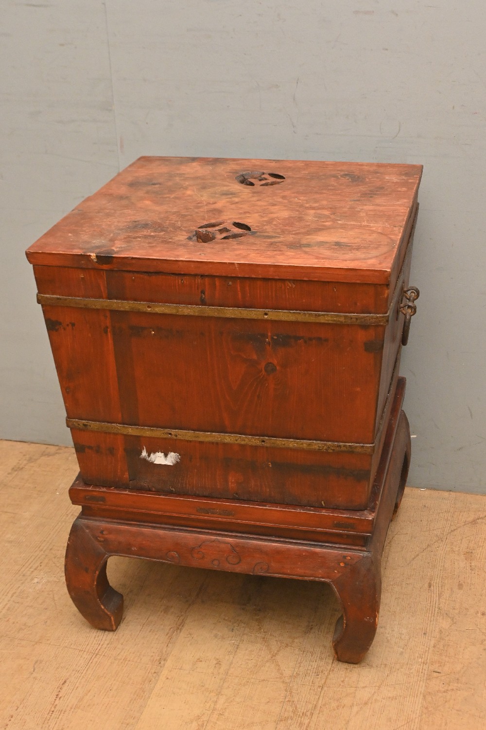 A CHINESE BRASS-BOUND WOOD CHEST ON STAND (A/F) (71H X 53W X 54D CM) (LEONARD JOEL DELIVERY SIZE: LARGE)