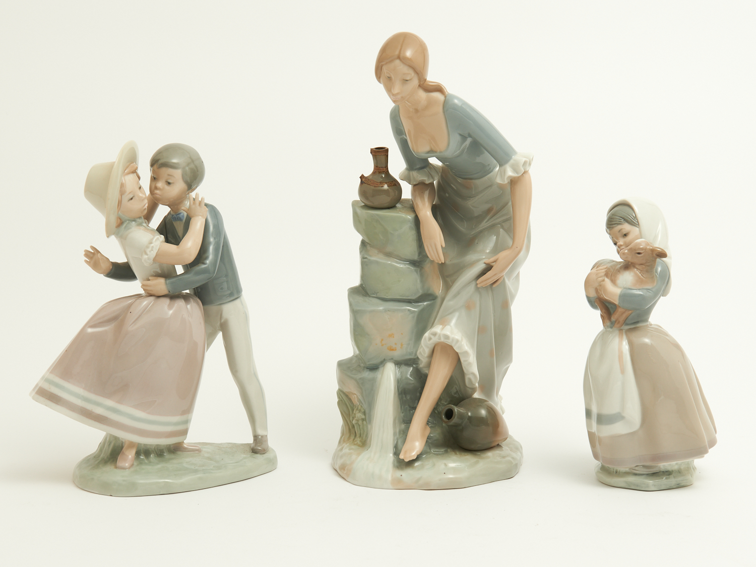 A LLADRO FIGURAL GROUP TOGETHER WITH TWO LLADRO NAO FIGURES H.33CM (LARGEST) (A/F), LEONARD JOEL DELIVERY SIZE: SMALL