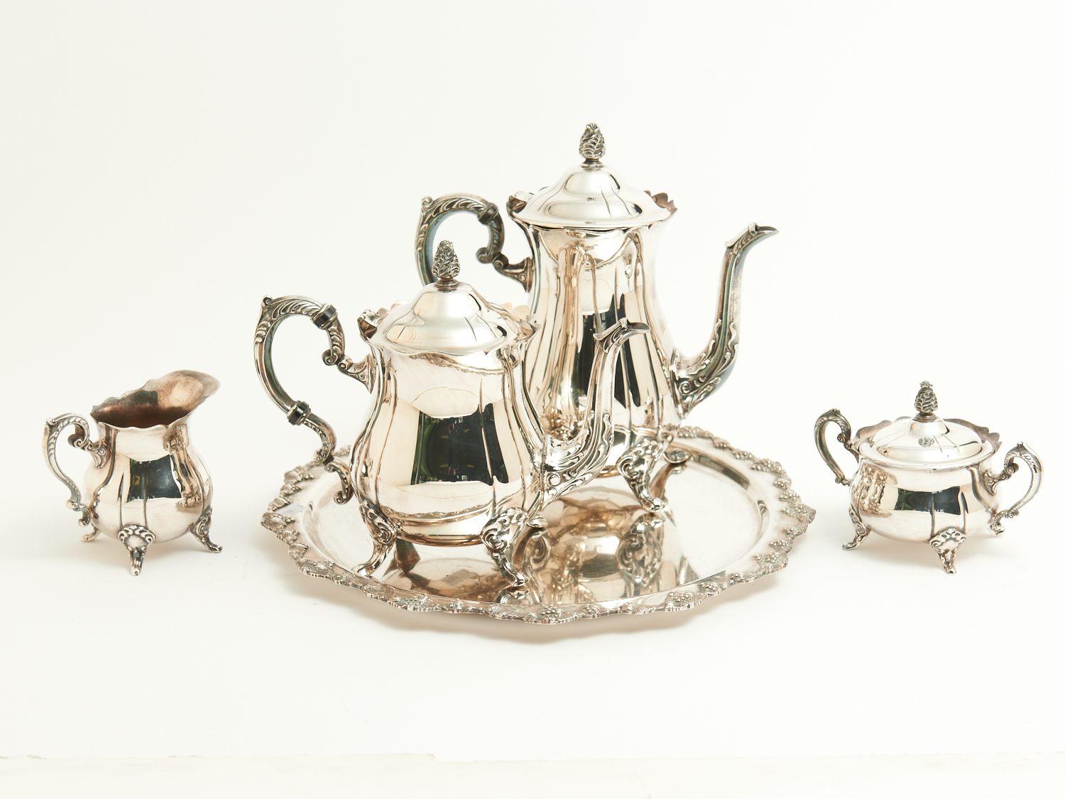 A SILVERPLATE TEA AND COFFEE SERVICE DIA.36CM (A/F, COFFEE POT HINGE), LEONARD JOEL DELIVERY SIZE: MEDIUM