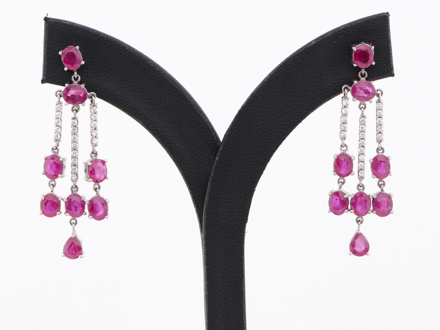 A PAIR OF RUBY AND DIAMOND EARRINGS IN 18CT WHITE GOLD, TO POST AND BUTTERFLY FITTINGS, 50MM