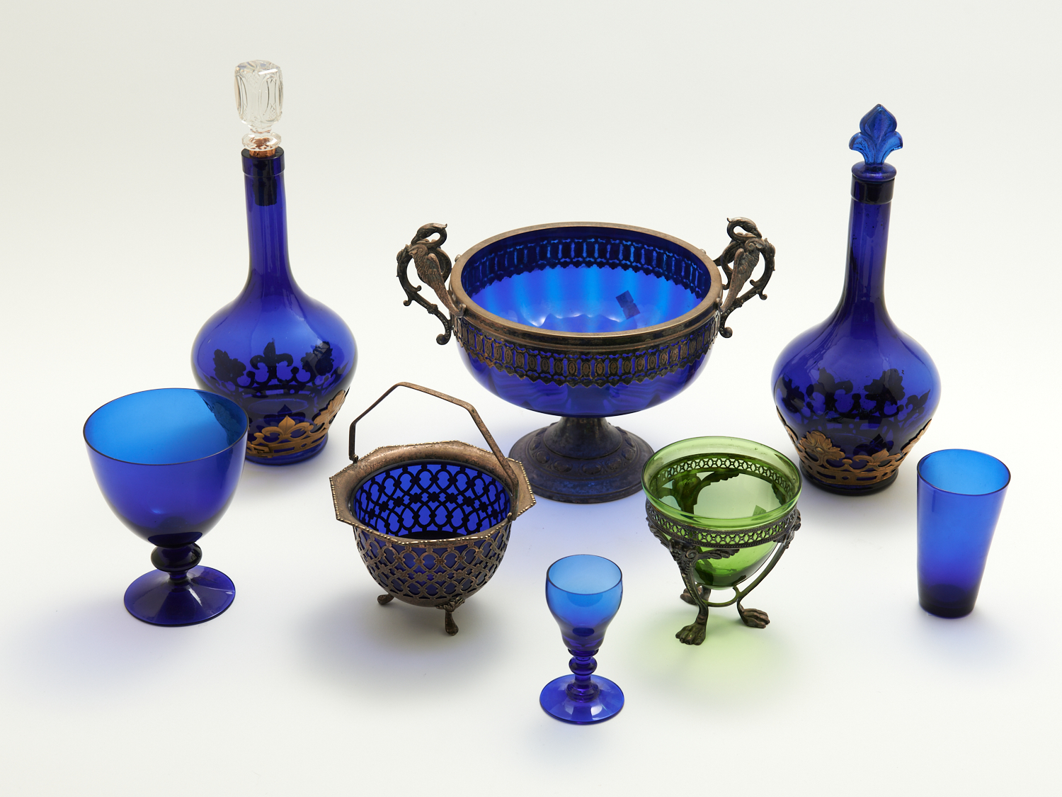 A GROUP OF COBALT BLUE GLASS INCLUDING TWO DECANTERS, A FOOTED CENTRE BOWL, AND THREE GLASSES TOGETHER WITH ONE GREEN GLASS INSET BOWL H.31CM (TALLEST) (A/F), LEONARD JOEL DELIVERY SIZE: MEDIUM