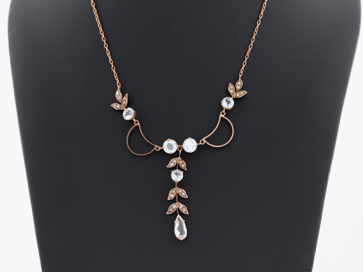 AN EDWARDIAN SEED PEARL AND AQUAMARINE NECKLACE IN 9CT GOLD, RETAILED BY PROUDS, ACCOMPANIED BY A BOX