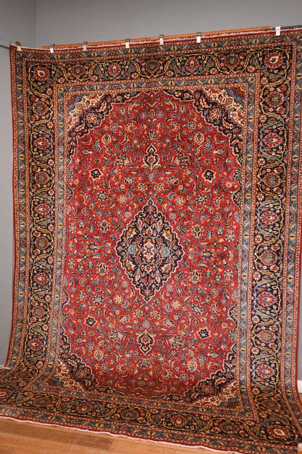 A CLASSIC PERSIAN KASHAN CARPET, 100% HAND KNOTTED WOOL. SOLID DENSE PILE. CLASSIC KASHAN DESIGN OF ELONGATED DIAMOND FLORAL MEDALLION IN PERSIAN BLUE ON A ROYAL RED FIELD OF SHAH ABBASI PALMETTES, FLORAL MOTIFS, TENDRILS. BORDER IN PERSIAN BLUE OF PALMETTES, ESLIMI SCROLLS AND ROSETTES. RRP: $5,800 - SIZE: 396 X 280 CM ORIGIN: IRAN DOCUMENTATION OF AUTHENTICITY INCLUDED.