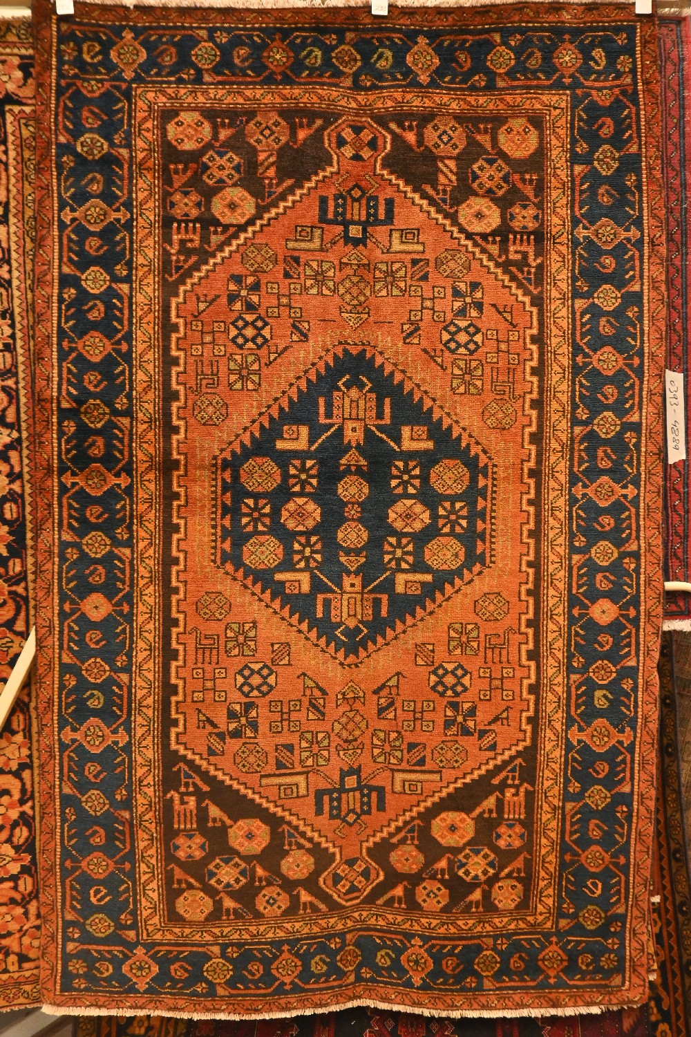 A PERSIAN TRIBAL TAROOM RUG. 100% WOOL, NATURAL DYES. CENTRAL ELONGATED HEXAGONAL MEDALLION CONTAINING TRIBAL ROSETTES AND GEOMETRIC MOTIFS ON A SOFT RED AND NAVY FIELD. BORDER OF FLOWER HEADS AND TRIBAL MOTIFS. SIZE: 207 X 132 CM - ORIGIN: PERSIA – RRP: $1,300 DOCUMENTATION OF AUTHENTICITY INCLUDED.