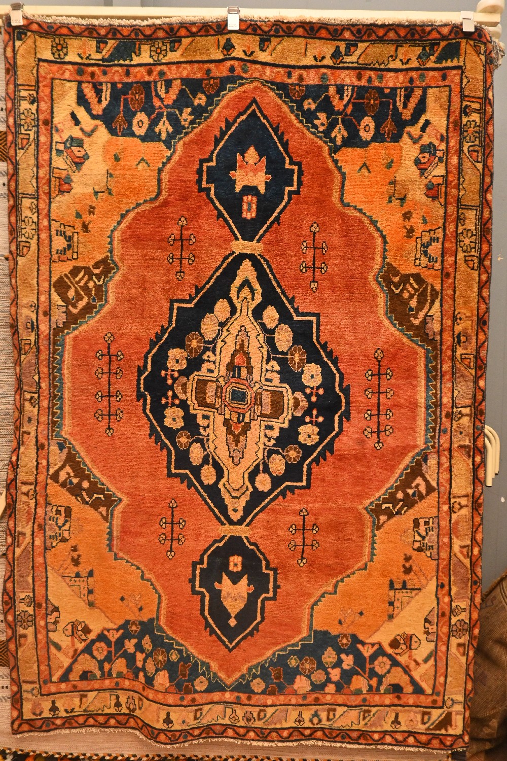 A PERSIAN NOMADIC LURISTAN CHESHME RUG, 100% WOOL AND NATURAL DYES, SOLID AND DENSE. HAND KNOTTED NOMADIC WEAVE WITH A DESIGN OF CENTRAL ANCHORED MEDALLION CONTAINING TRIBAL MOTIFS AND ROSETTES ON A DEEP BURNT ORANGE TONE FIELD. CORNER TRIBAL MEDALLIONS. SIZE: 213 X 148 CM ORIGIN: PERSIA – RRP: $1,800 DOCUMENTATION OF AUTHENTICITY INCLUDED.