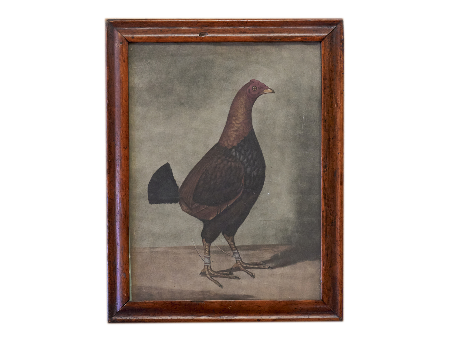 AN EARLY 19th CENTURY HAND-COLOURED AQUATINT PORTRAIT OF A FIGHTING COCK, IN AN ANTIQUE MAPLE FRAME 48.5 X 38CM, LEONARD JOEL DELIVERY SIZE: MEDIUM