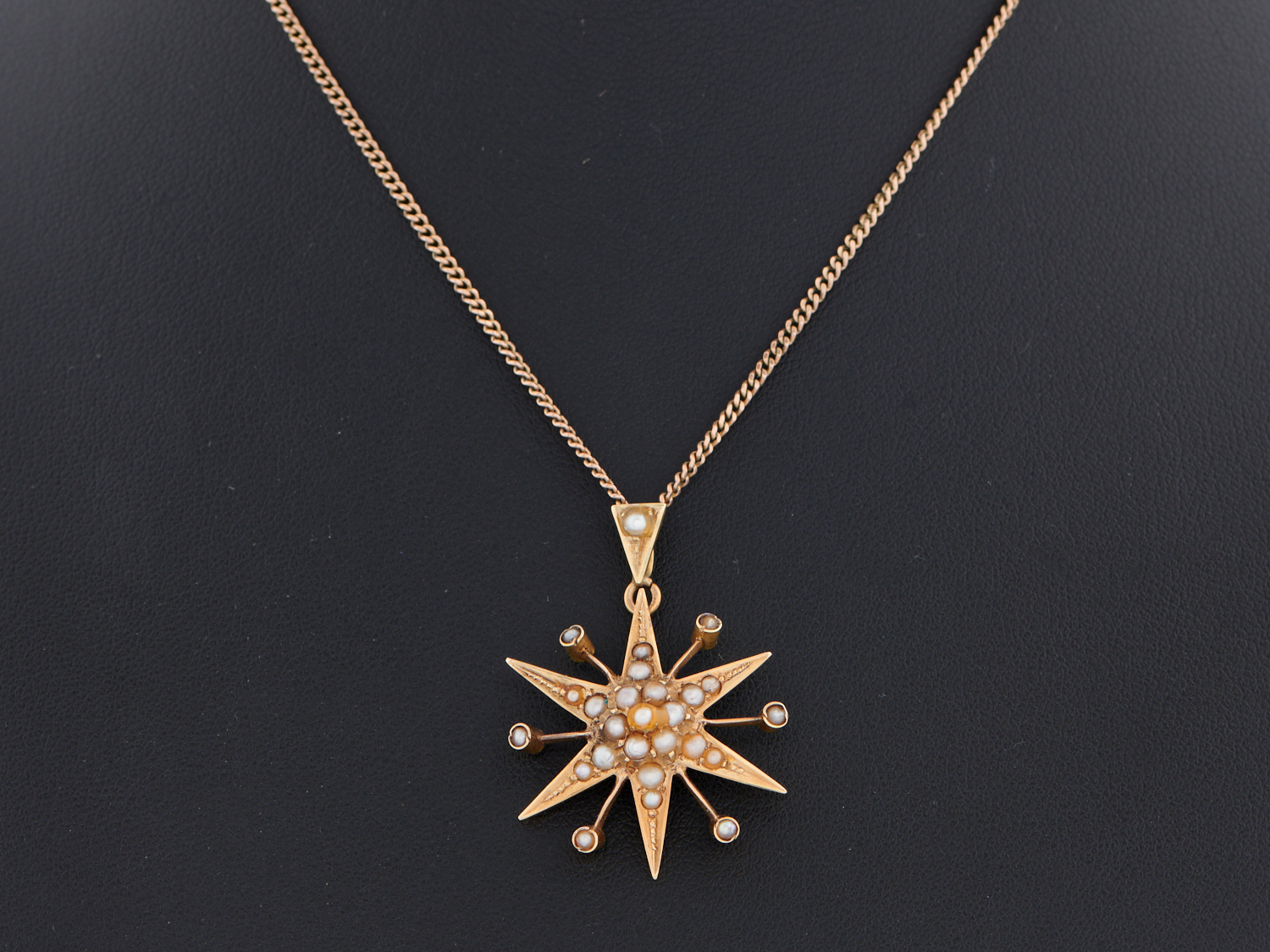 A SEED PEARL PENDANT AND CHAIN IN 15CT AND 9CT GOLD, 620MM, 7.7GMS