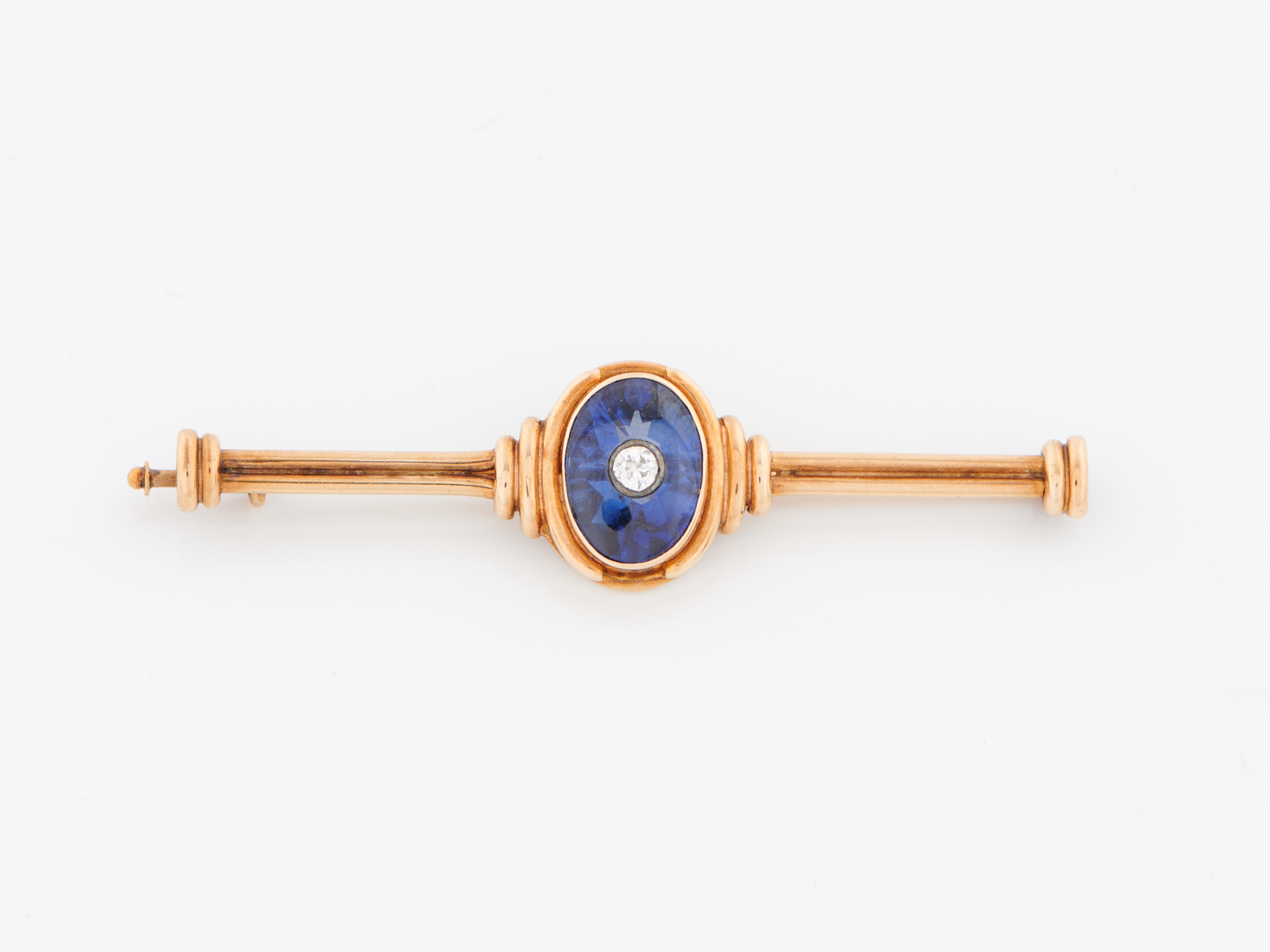 A DIAMOND AND SAPPHIRE BROOCH IN 14CT GOLD, APPOXIMATELY 65MM, 11.0GMS