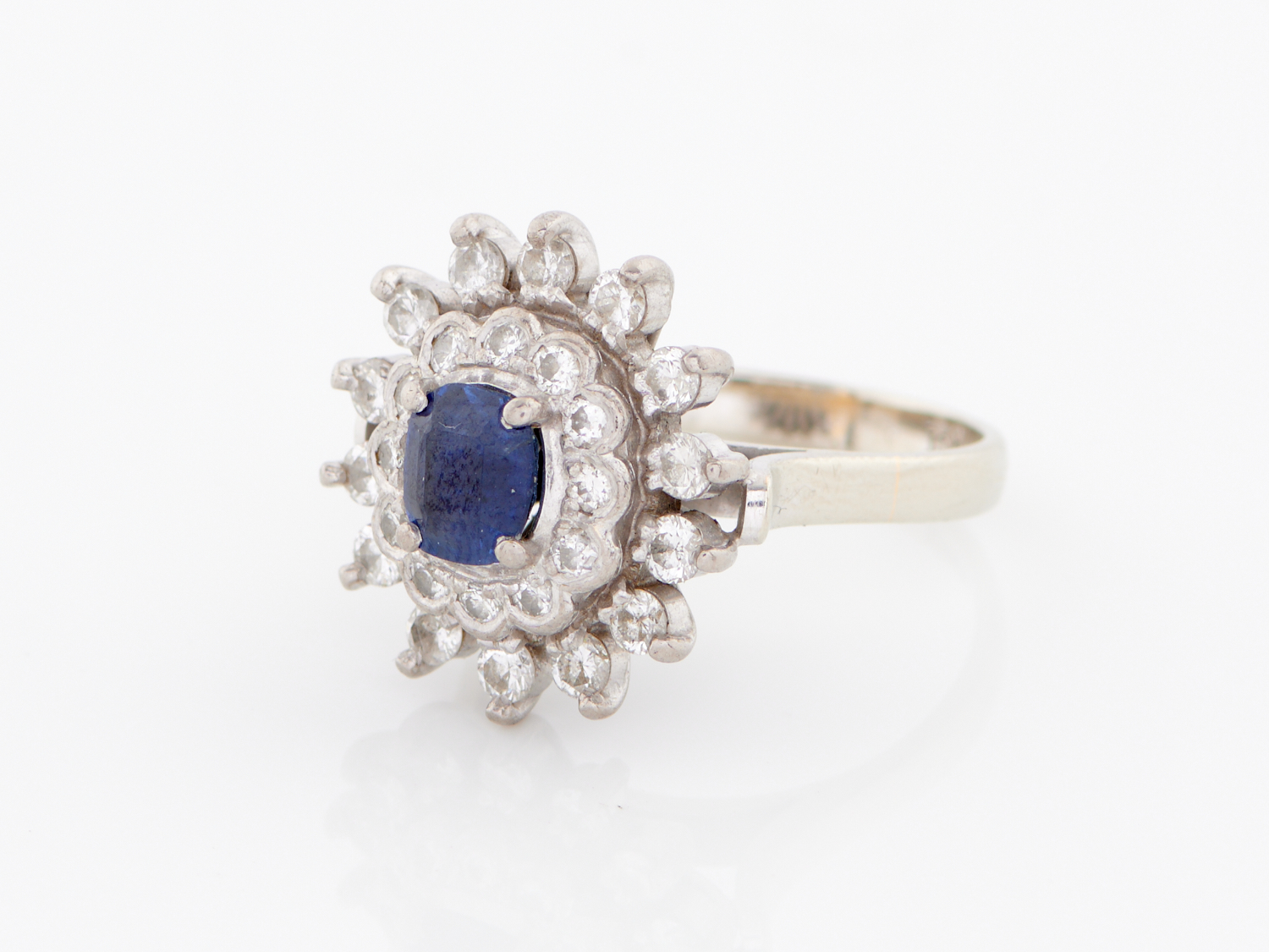 A SAPPHIRE AND DIAMOND CLUSTER RING IN 18CT WHITE GOLD, SIZE M, 6.6GMS