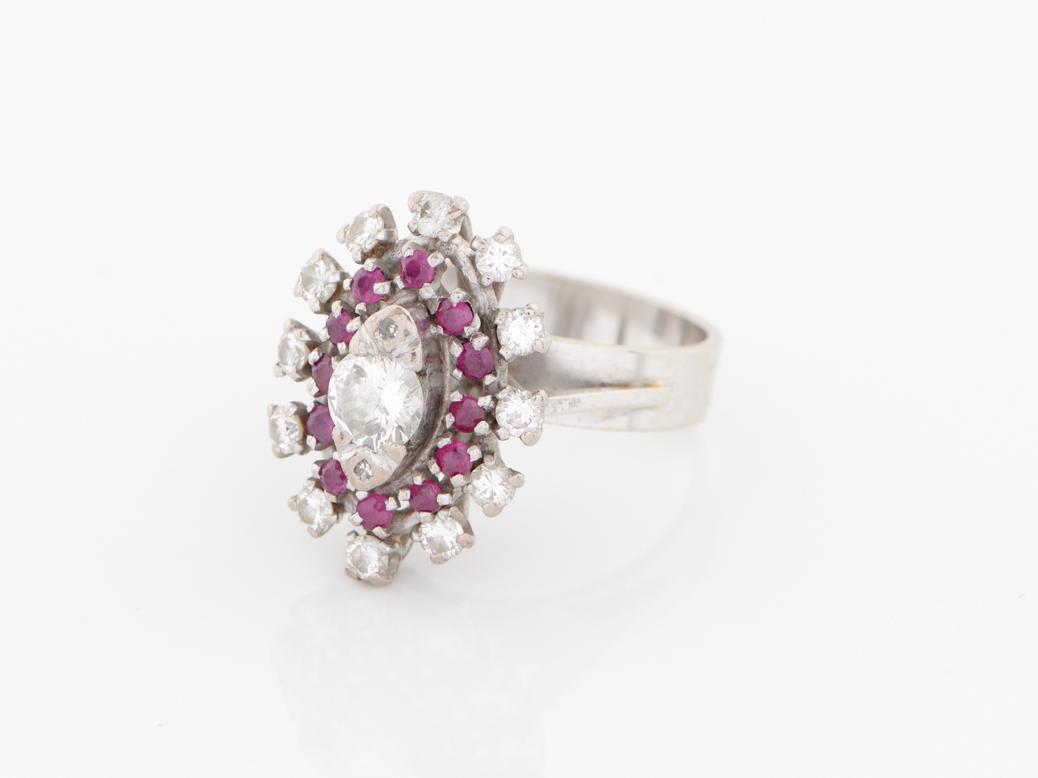 A DIAMOND AND RUBY CLUSTER RING IN 18CT WHITE GOLD AND PALLADIUM, SIZE M, 8.56GMS