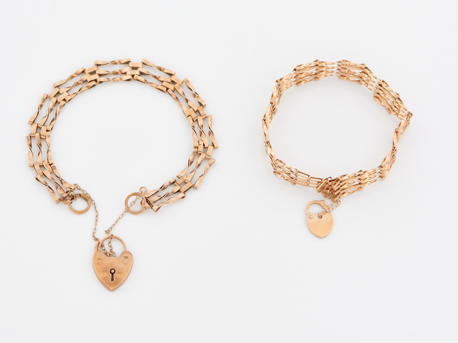 TWO GATE LINK HEART PADLOCK BRACELETS IN 9CT GOLD, 13.5GMS