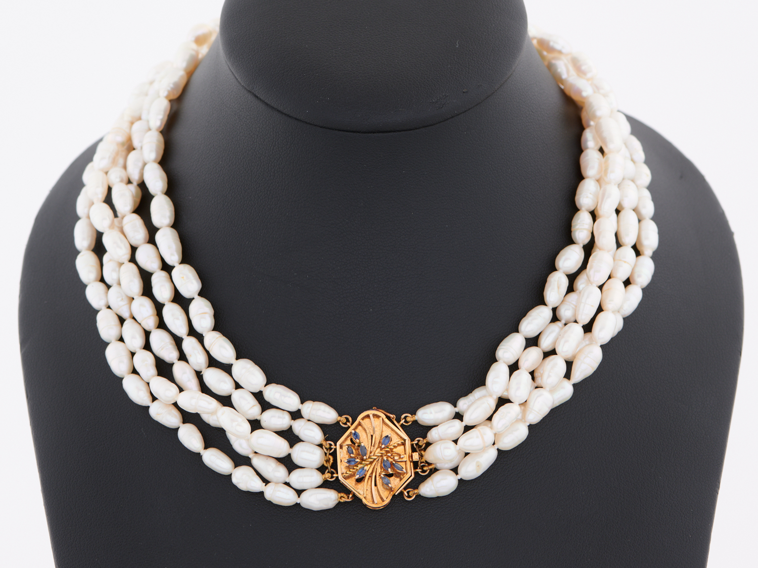 A MULTI STRAND FRESHWATER PEARL NECKLACE TO A SAPPHIRE CLASP IN 14CT GOLD, APPOXIMATELY 370MM
