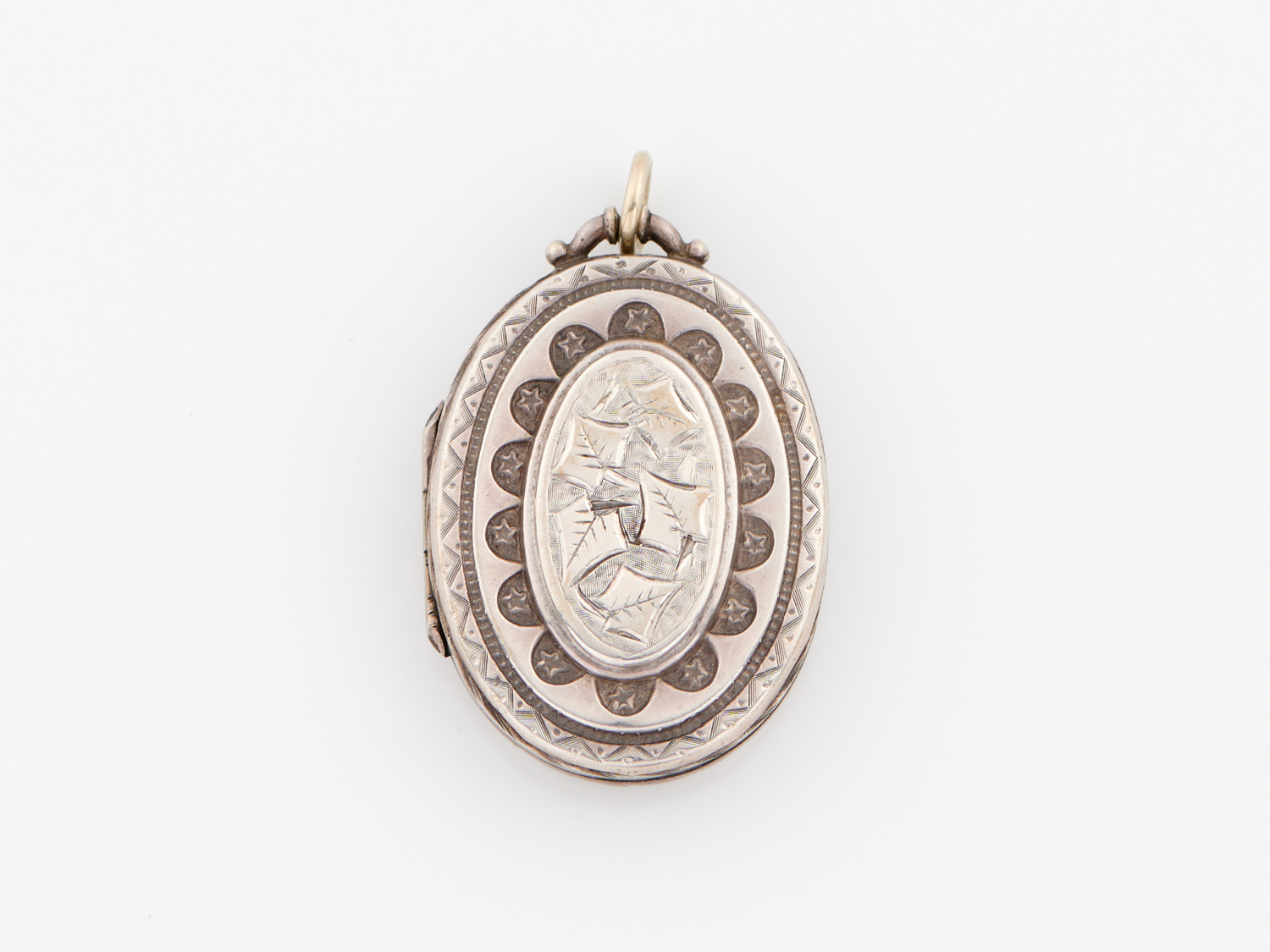 AN ANTIQUE HINGED LOCKET IN SILVER, 35 X 25MM