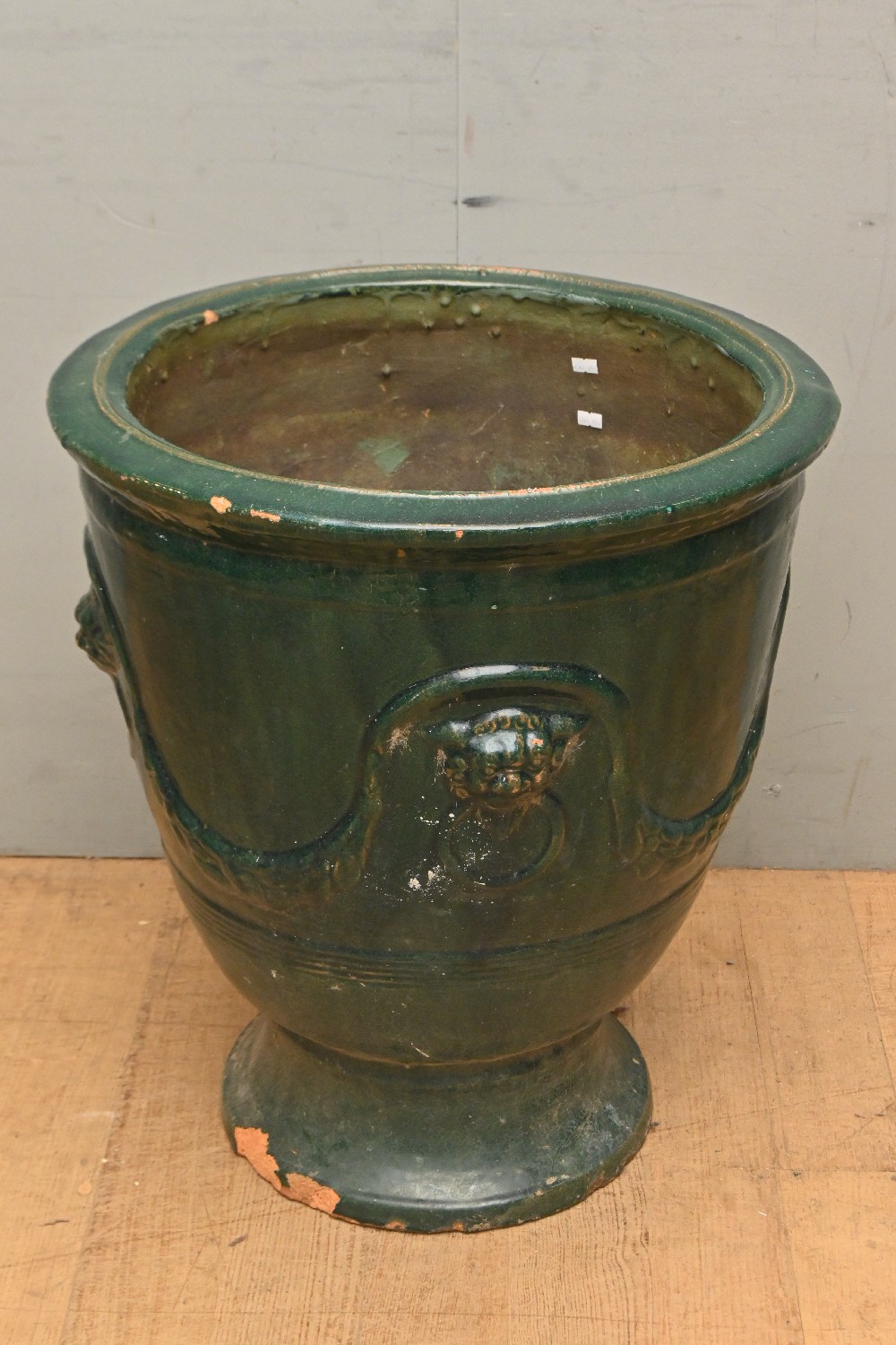 AN EARLY 20TH CENTURY FRENCH GREEN GLAZED TERRACOTTA GARDEN URN (A/F) (64H X 67D CM) (PLEASE NOTE THIS HEAVY ITEM MUST BE REMOVED BY CARRIERS AT THE CUSTOMER'S EXPENSE. LEONARD JOEL STAFF CANNOT ASSIST CARRYING THIS ITEM) (LARGE ITEM)