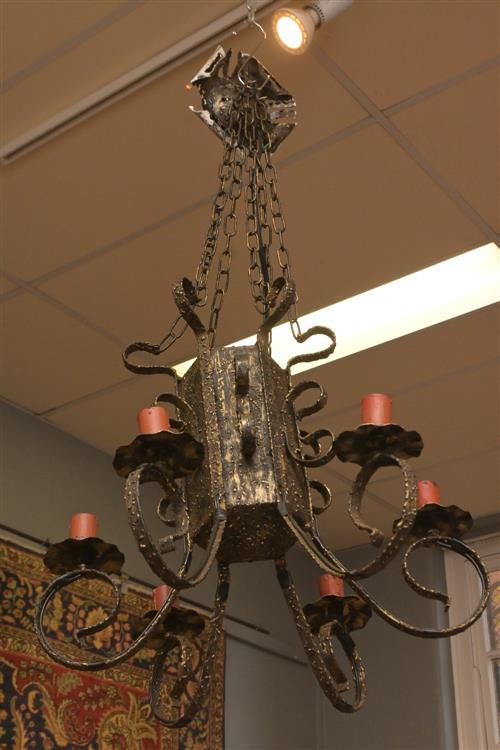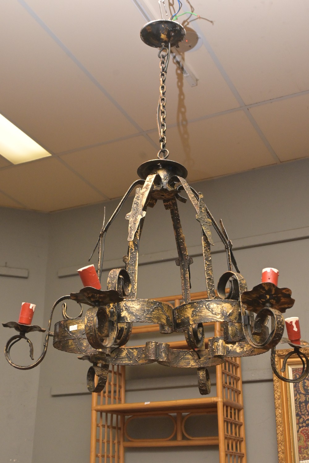 TWO MID CENTURY BRUTALIST WROUGHT IRON CHANDELIERS (A/F) (110H X 72D CM) (PLEASE NOTE THIS HEAVY ITEM MUST BE REMOVED BY CARRIERS AT THE CUSTOMER'S EXPENSE. LEONARD JOEL STAFF CANNOT ASSIST CARRYING THIS ITEM) (LARGE ITEM)